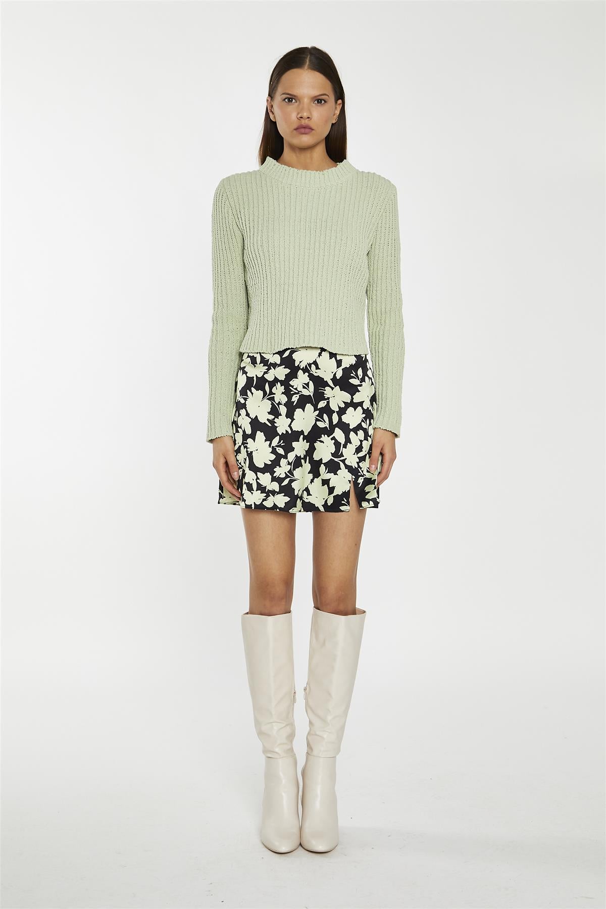 Soft-Lime Black-Floral Notch-Split Mini-Skirt