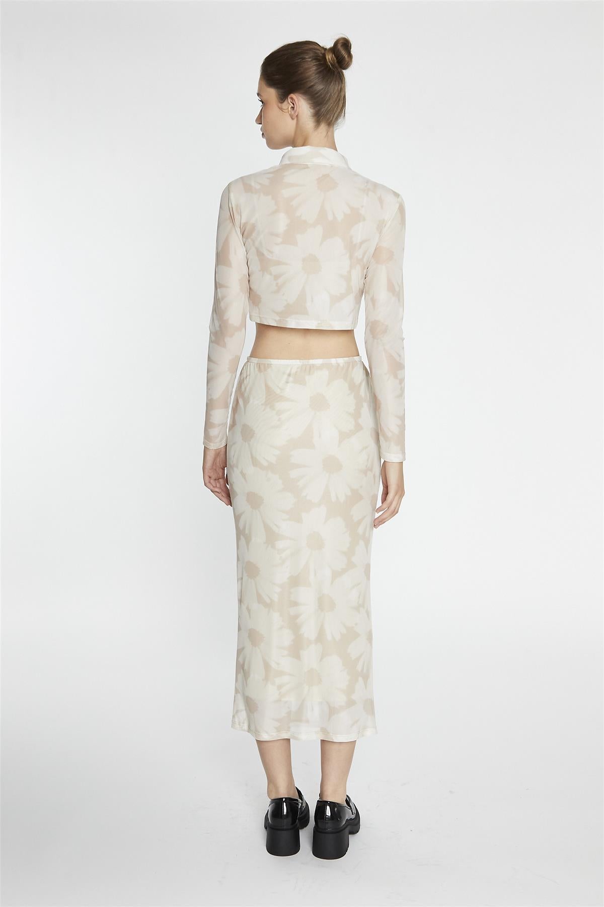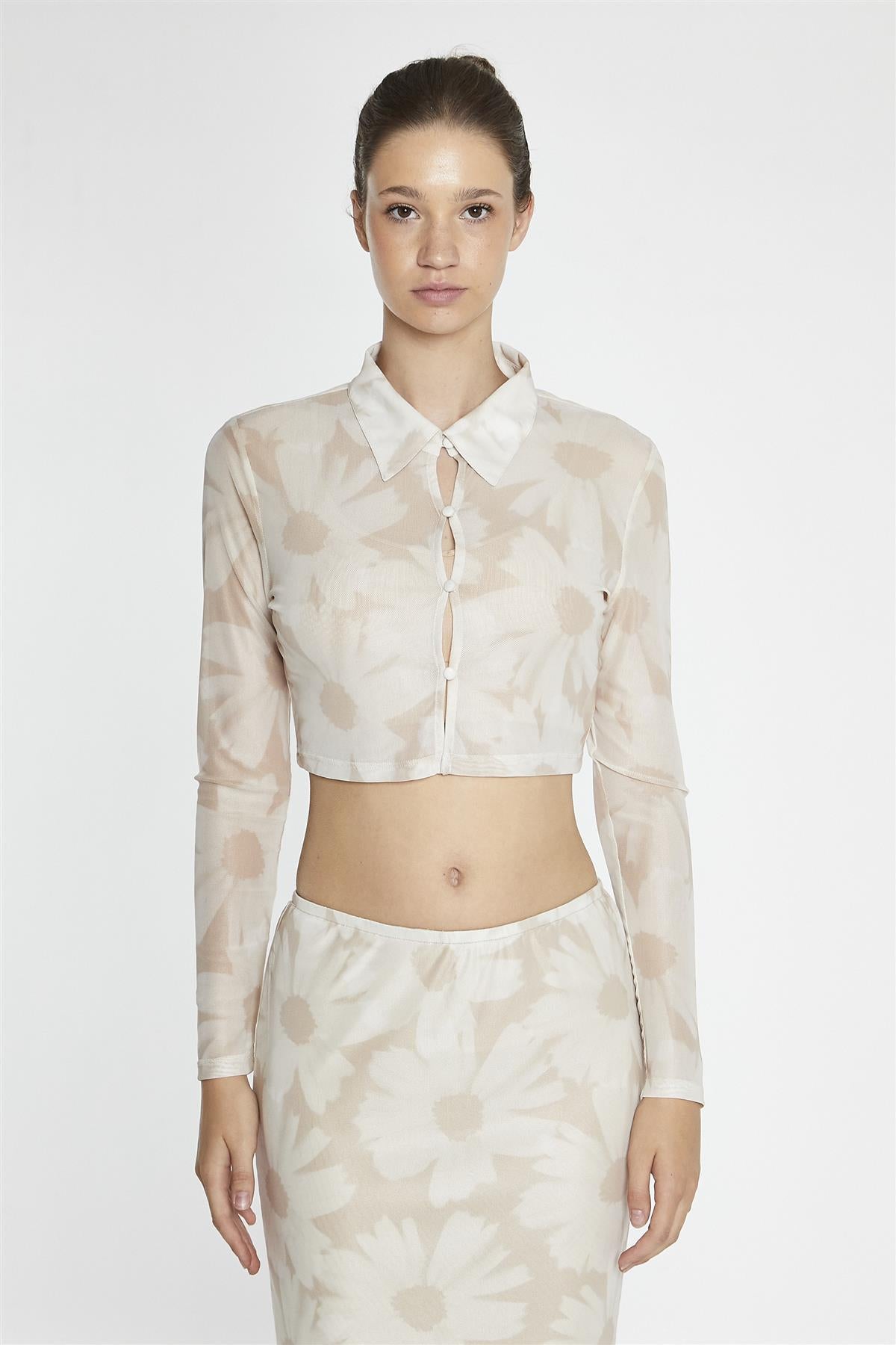 Glamorous Women's Stone-Sunflower Mesh Shirt Crop-Top. Bring a touch of effortless style to your wardrobe with this stone-toned mesh crop top. The neutral base is elevated by a tonal sunflower print, creating a fresh, understated look that's perfect for the warmer months. The mesh fabric adds a breezy, lightweight feel, while the bodycon fit hugs your curves in all the right places. The classic shirt design, complete with a collar and button placket, gives this crop top a polished, put-together vibe. The cropped length is perfect for showing off your waistline, whether you pair it with high-waisted jeans, shorts, or a skirt. This versatile top can be dressed up or down to suit any occasion - throw on a blazer and heels for a night out, or keep it casual with denim and sneakers for a weekend brunch. The tonal sunflower print adds a subtle touch of natural beauty, making this crop top a must-have addition to your warm-weather wardrobe..