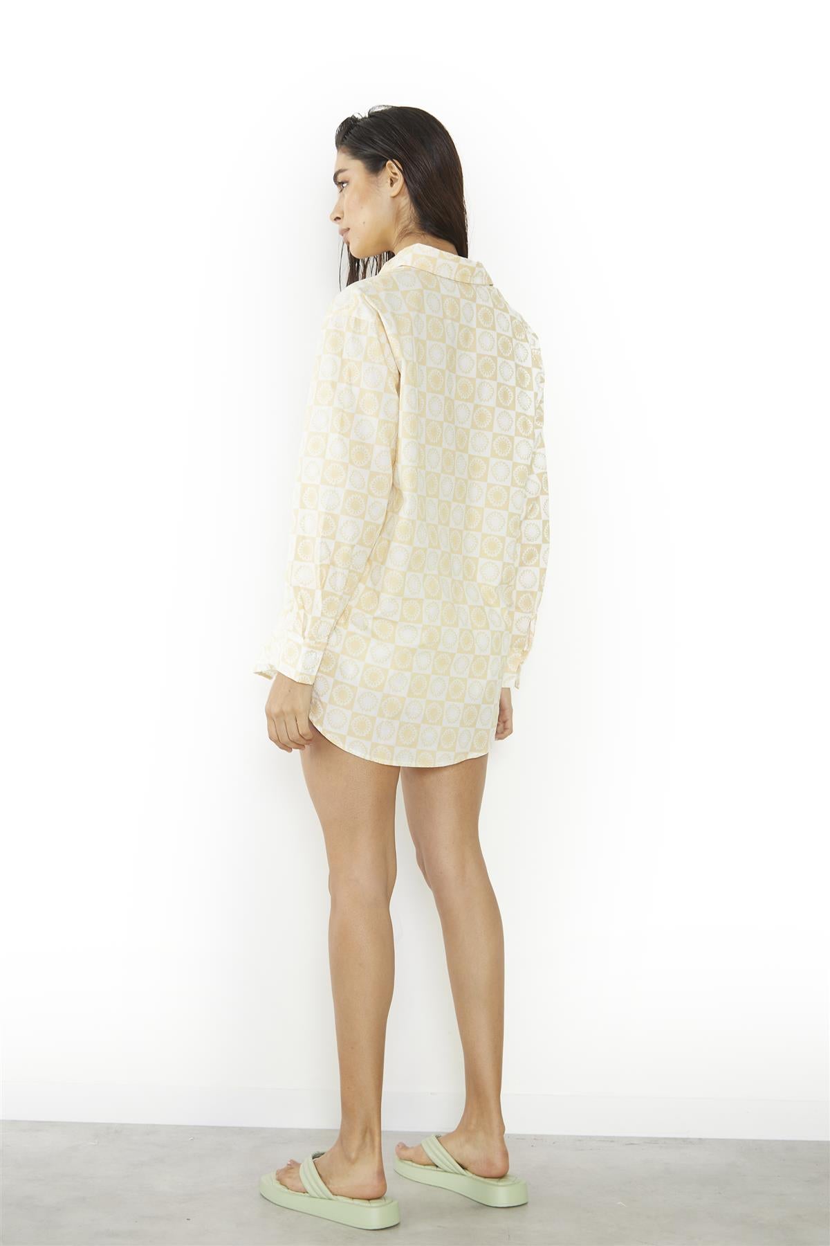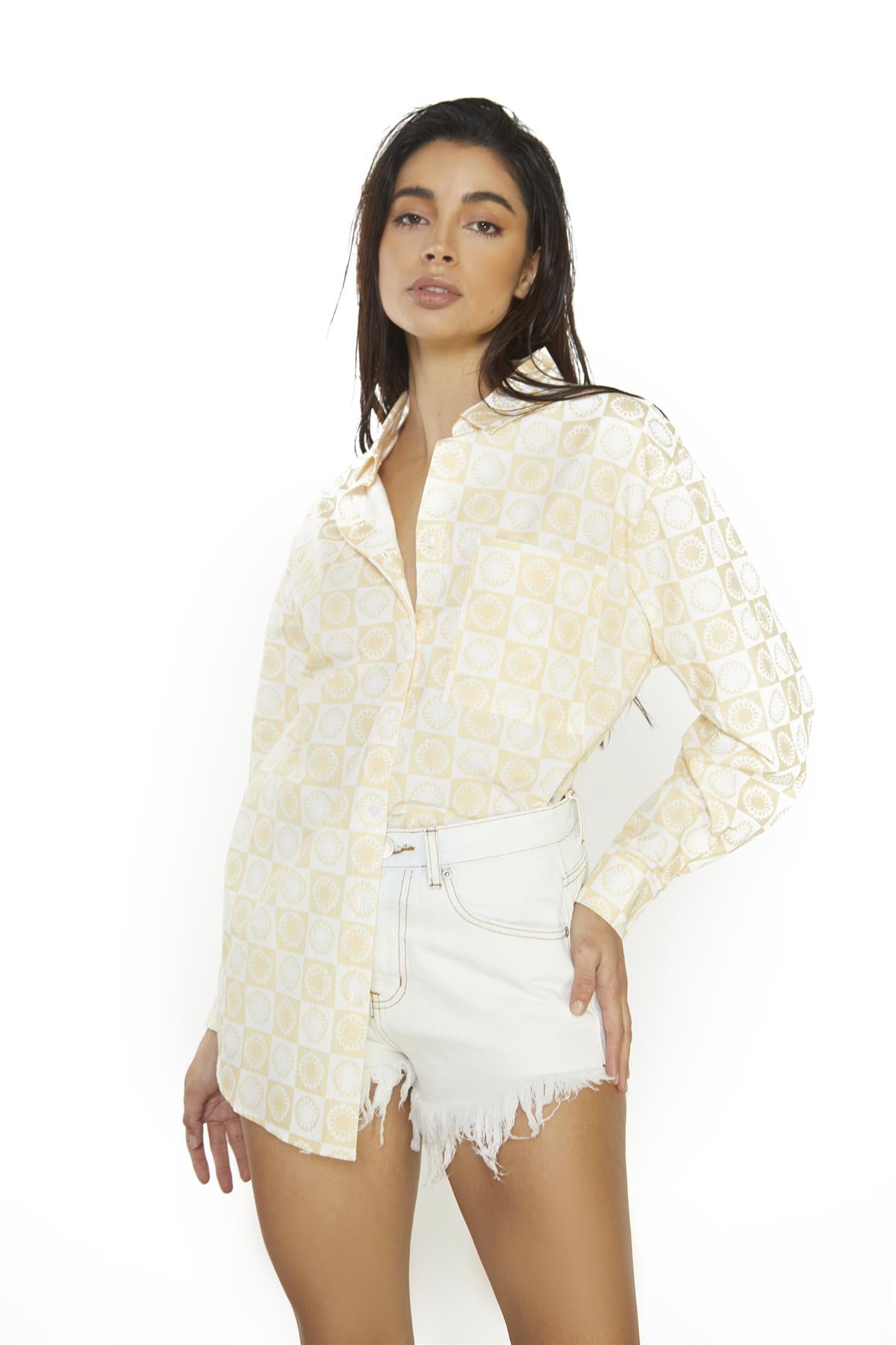 Glamorous Women's Sunflower-Check Collared Long Sleeve-Top. This charming collared top brings a touch of sunshine to your wardrobe with its delightful sunflower check pattern. The long sleeves offer versatility, making it suitable for various seasons and occasions. A classic button-front design adds a timeless element, allowing you to adjust the neckline to your liking. The cheerful floral print creates a lively, uplifting look that's sure to brighten your day and turn heads. Pair this top with your favourite jeans for a casual weekend outing, or tuck it into a high-waisted skirt for a more polished ensemble. Layer it under a jumper on cooler days, letting the collar peek out for added interest. Roll up the sleeves and knot the front for a relaxed, summery vibe. This versatile piece transitions effortlessly from day to night, making it a brilliant addition to your wardrobe. It's a fun and fresh way to incorporate both checks and florals into your everyday style.