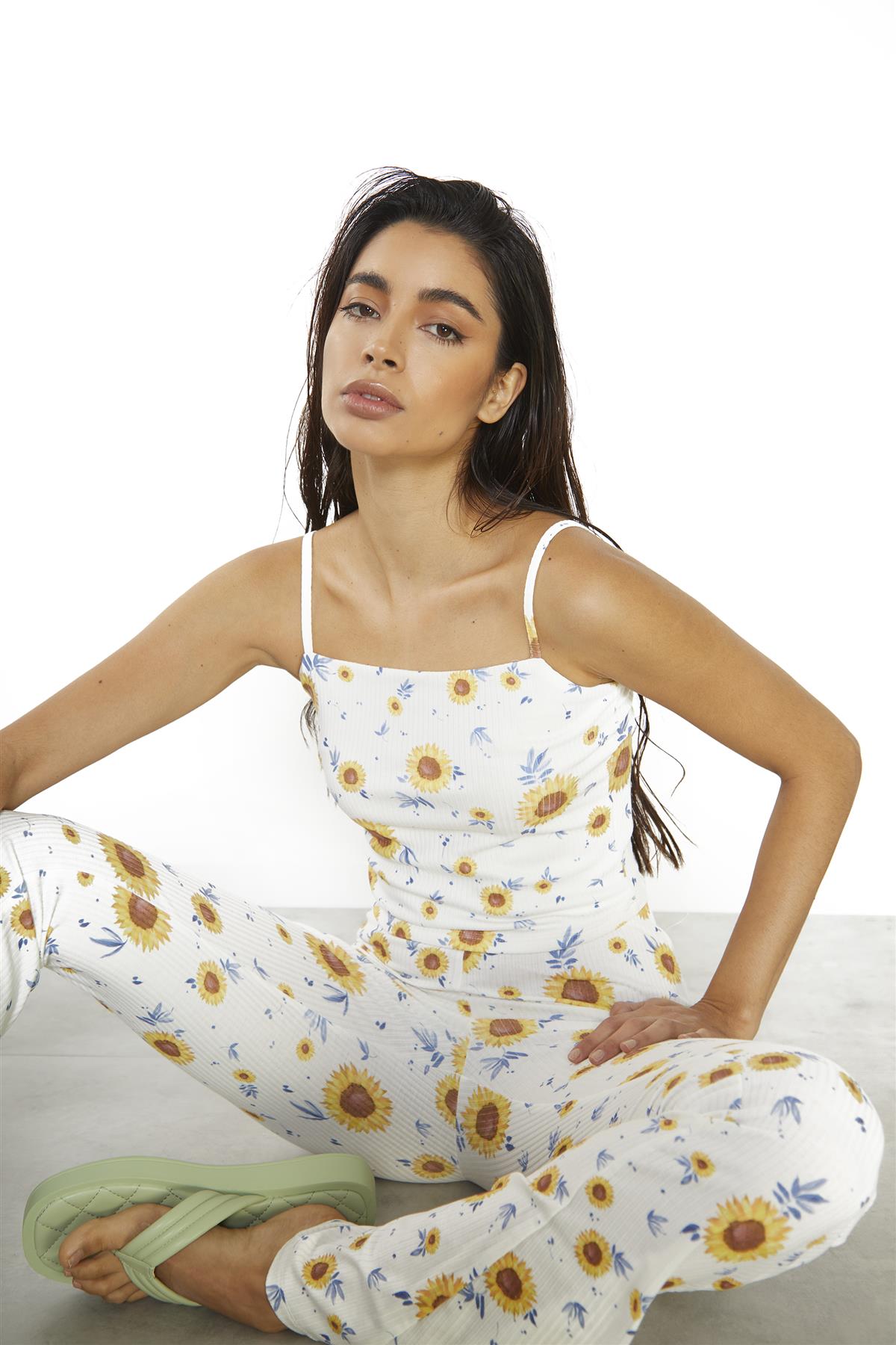 Glamorous Women's Sunflower-Rib Crop-Top. Say hello to our cheerful sunflower ribbed crop-top, a little slice of summer you can wear any time. This cute and comfy top brings a ray of sunshine to your wardrobe with its vibrant floral print. The ribbed texture adds a touch of interest and hugs your curves just right, while the cropped length gives it a flirty, modern edge. Thin spaghetti straps keep things cool and casual, perfect for those warm days or layering under a jacket when the evening chill sets in. The sunflower design spreads joy and positivity, making it a go-to piece for brightening up your day and your outfit. For a complete look, this crop-top pairs perfectly with our matching sunflower ribbed bottoms, creating a coordinated ensemble that’s sure to turn heads. Whether you choose high-waisted jeans or a flowing skirt, this versatile crop-top is destined to become a favourite in your rotation, bringing a smile to your face every time you put it on.