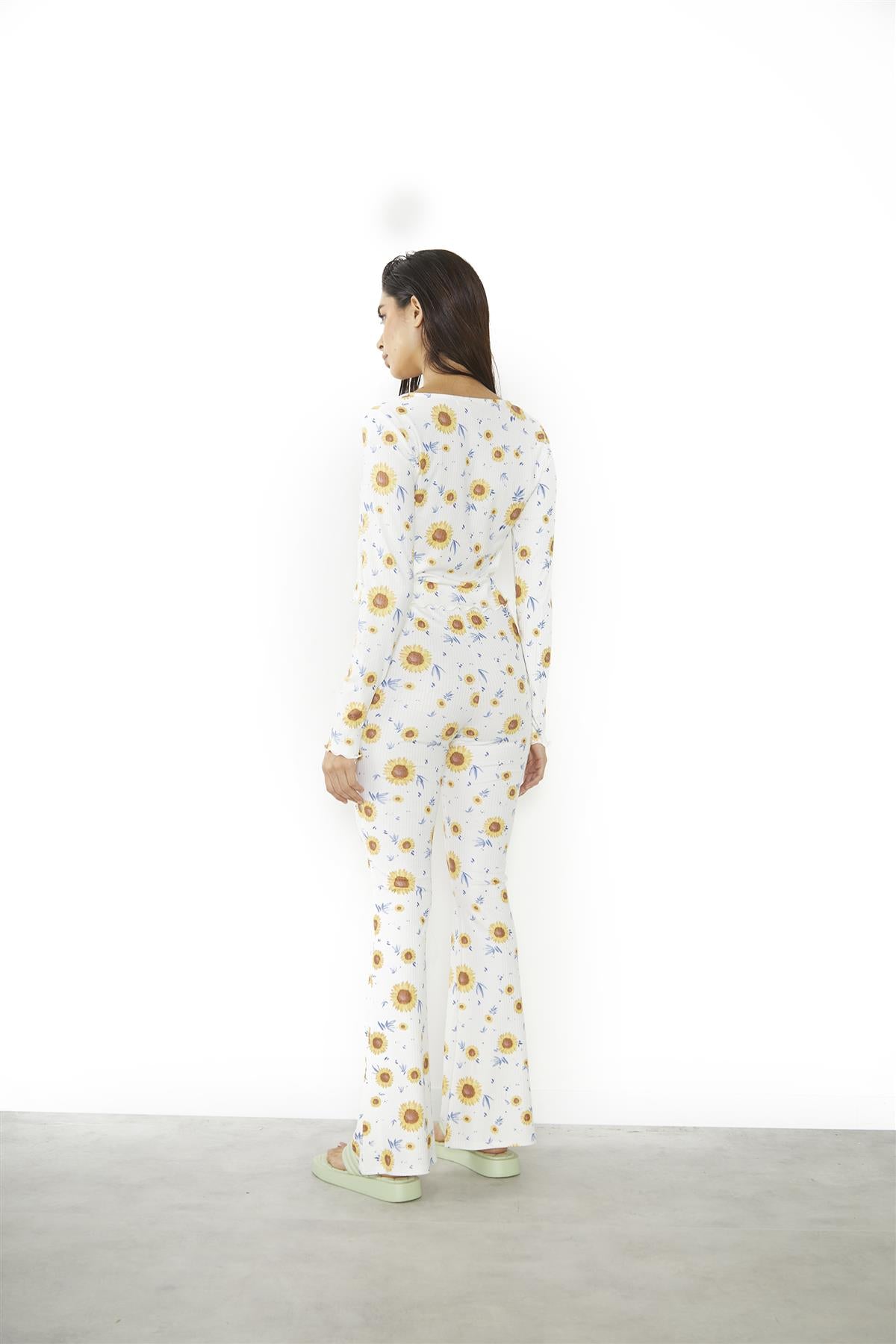 Glamorous Women's Sunflower Rib Tie-Front -Top. Introducing our Sunflower Rib Tie-Front Top, a delightful addition to your wardrobe! This top features a charming tie-front design that adds a touch of playfulness to your look. With long sleeves, you can stay cozy while looking stylish. Pair it with our matching trousers for a coordinated ensemble that's perfect for any occasion. The rib fabric provides a comfortable and flattering fit, while the sunflower pattern adds a cheerful pop of colour to your day. Embrace your inner sunshine and let this top brighten up your day!
