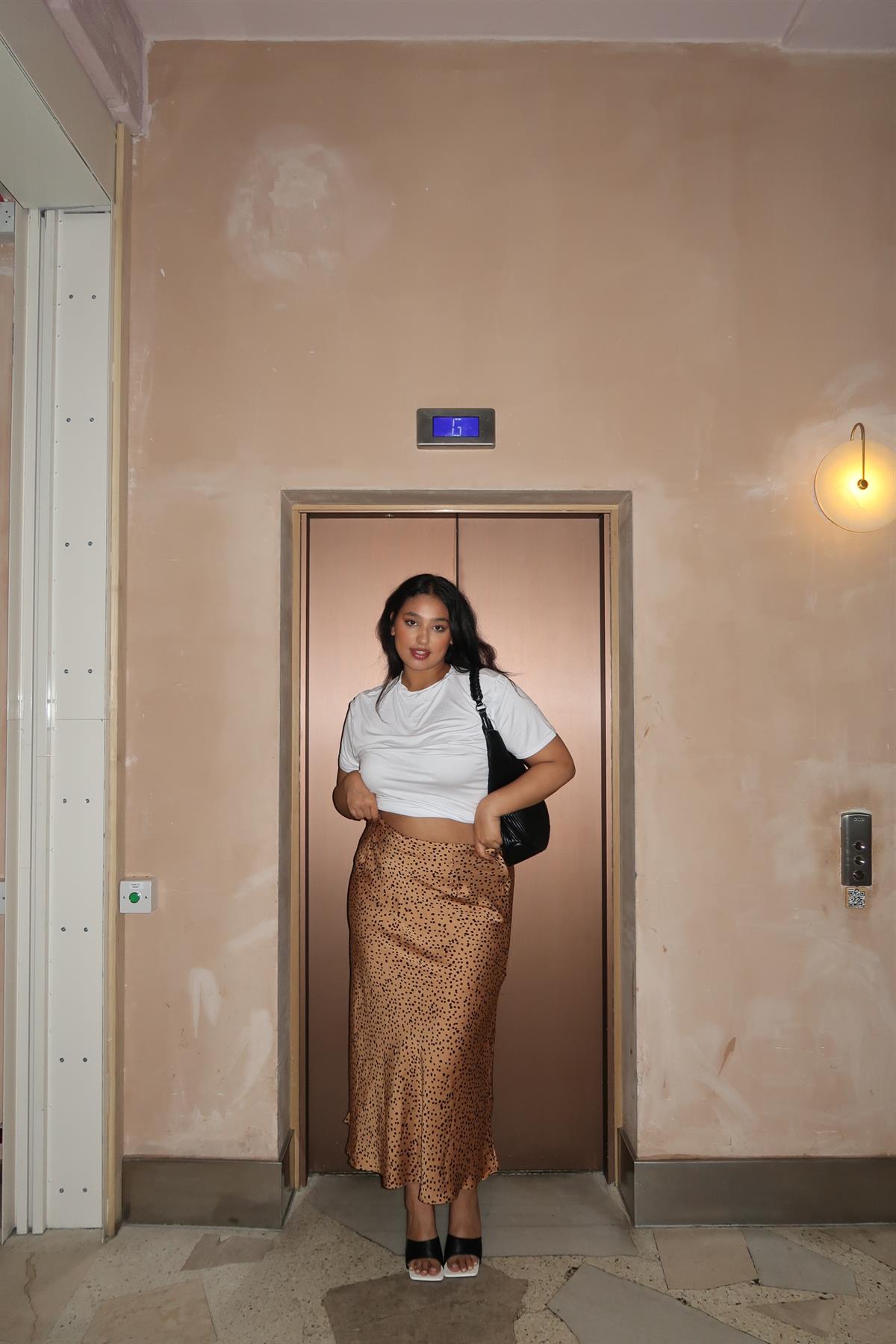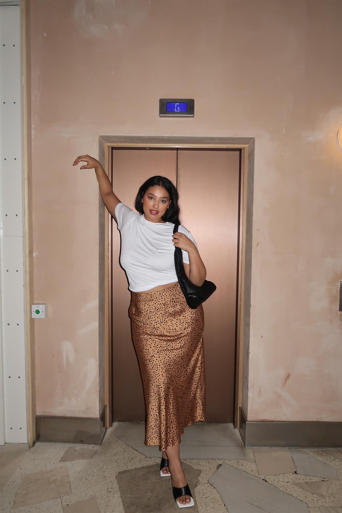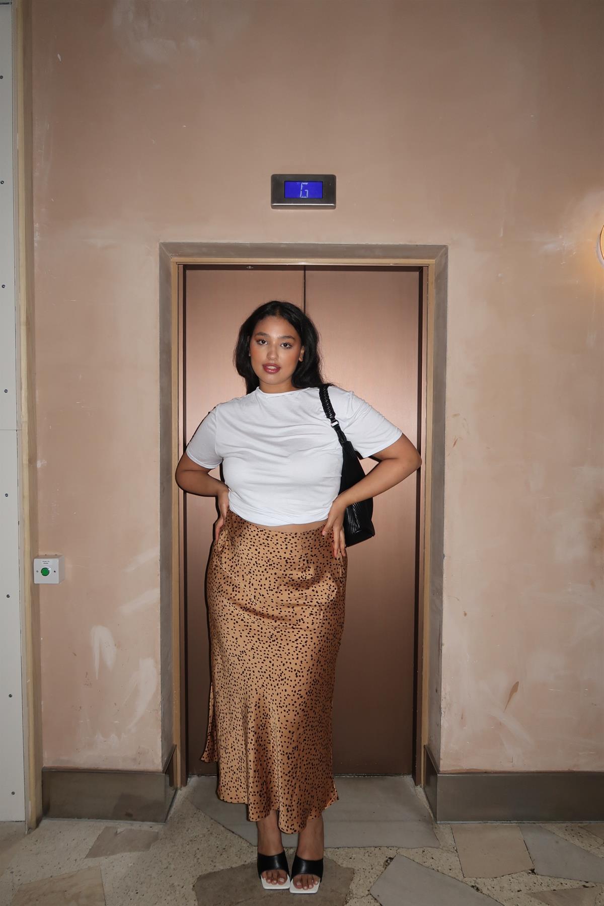 Glamorous Curve Women's Tan-Black Spot Bias-Cut Midi Skirt. Elevate your wardrobe with our Tan-Black Spot Bias-Cut Midi Skirt. This stunning piece features a flattering bias-cut design that gracefully drapes over your silhouette, ensuring a perfect fit. The playful tan and black spot pattern adds a touch of whimsy, making it versatile enough for both casual outings and elegant evenings. Crafted from a soft, breathable fabric, this skirt offers all-day comfort without sacrificing style. Pair it with a fitted top and ankle boots for a chic look or dress it up with heels and statement jewellery for a night out. Embrace effortless elegance with this must-have midi skirt!