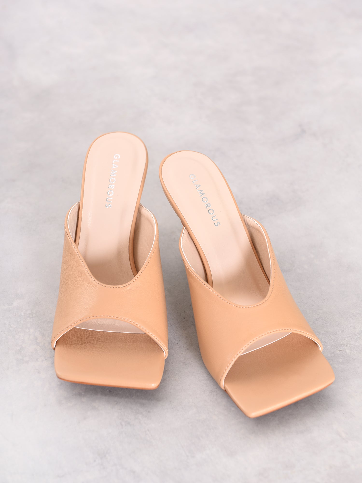 Glamorous Womens Tan Square Toe Heeled Mules. Featuring low heel and statement square toe, these soft tan heels will elevated every look. Look great styled with jeans for a chic date night look or dressed up with a cute mini dress to be the best dressed wedding guest.