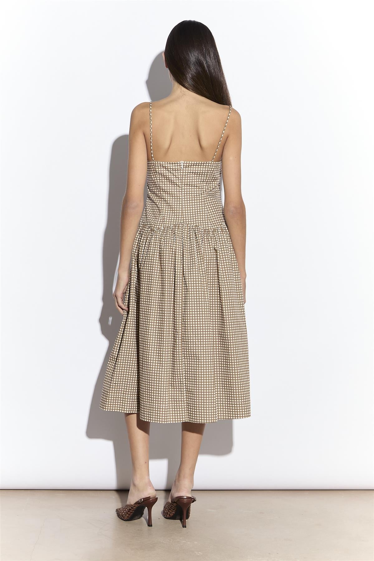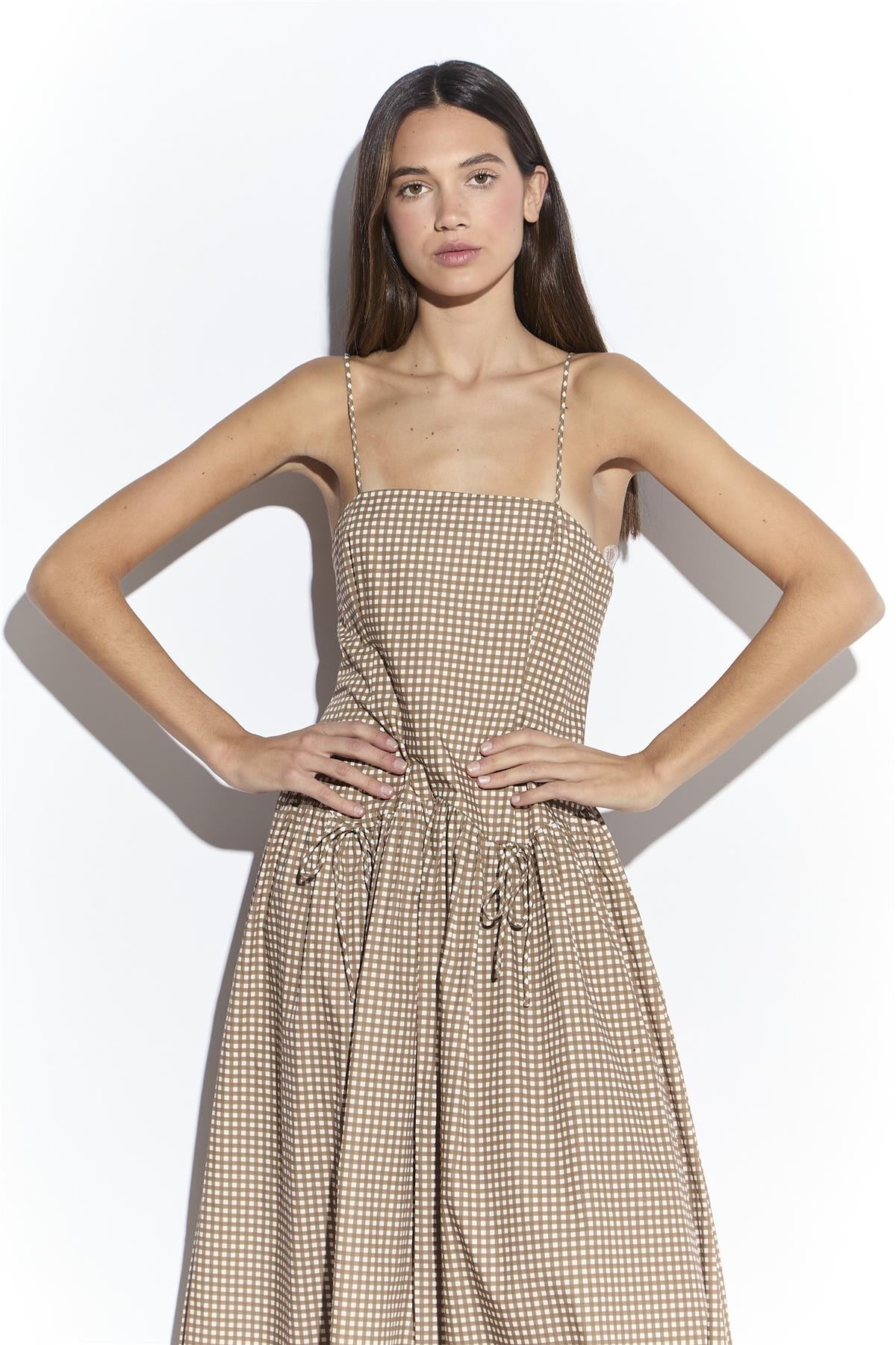 Narrated Women's Taupe Gingham Dropped Waist Cami Midi Dress. Light, graceful, and full of easy charm, this dropped waist cami dress brings a touch of effortless femininity to your wardrobe. The delicate cami straps and square neckline create a flattering, open shape, while the sleeveless design keeps the look simple and refined. A dropped waist cut gives it a relaxed, flowing fit that flatters every movement, and the rouleau bows at the front waist add a subtle, playful detail. Designed in a soft gingham pattern, it offers a timeless appeal that feels both fresh and versatile. Style with simple layers for an effortlessly polished finish.