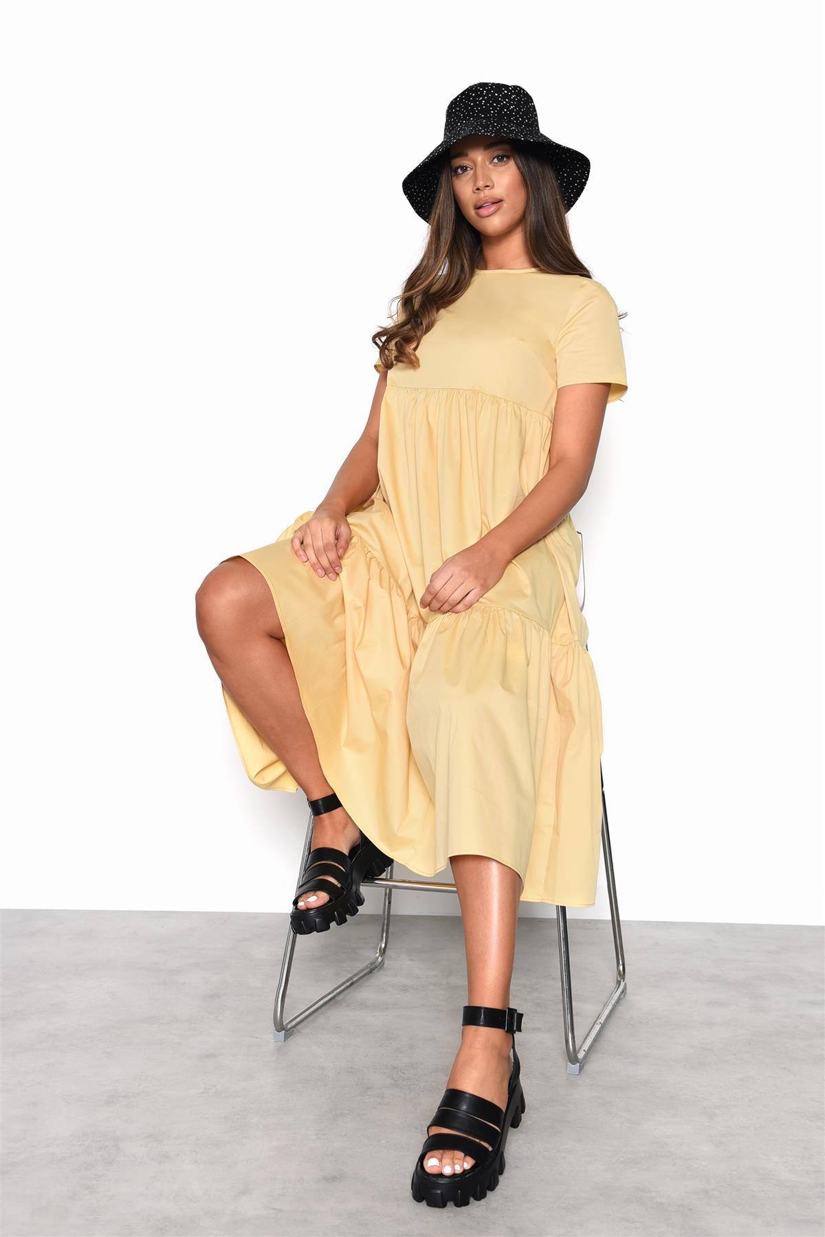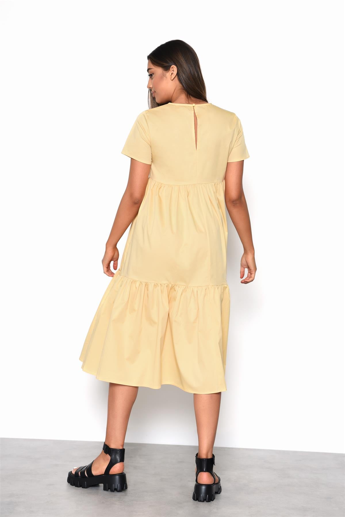 Glamorous Women's Tiered Midi Dress - Soft Yellow. Flow through your day with carefree ease in this tiered midi dress designed to make every moment feel effortlessly put together. The soft fabric moves beautifully with its gentle tiered skirt, while the midi length strikes the perfect balance between comfort and style. Short sleeves add a touch of simplicity, making it ideal for casual outings or easy weekend wear. Pair it with chunky sandals for an understated yet confident look that feels just right, wherever your plans take you.