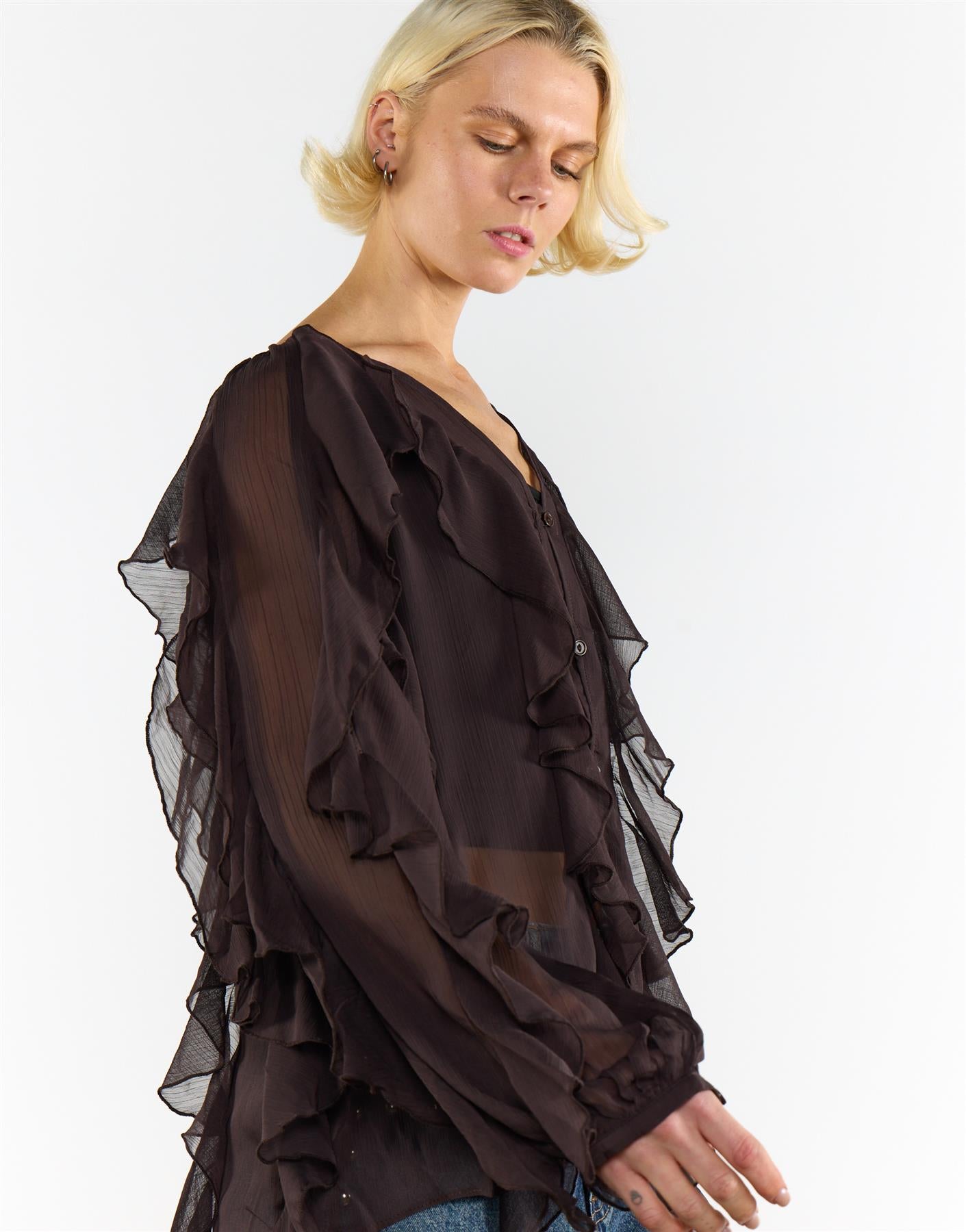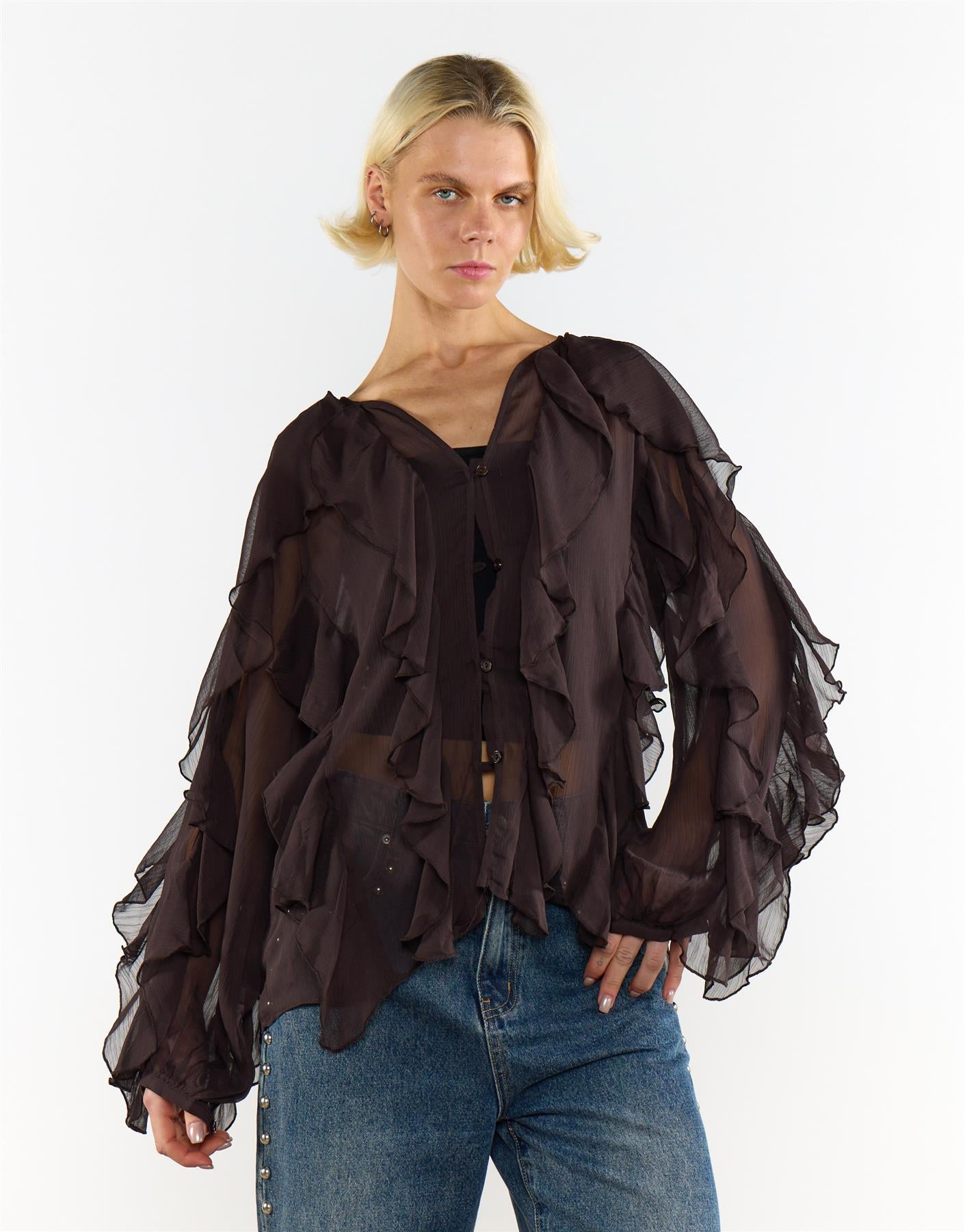 Glamorous Women's V Neck Ruffle Blouse - Deep Brown. Soft ruffles meet an elegant shape in this V-neck blouse, creating a style that feels both graceful and easy to wear. The flattering V-neckline draws the eye, while the multi lace ruffle layers bring beautiful texture and subtle movement that elevate any outfit. Long sleeves give the look a balanced finish, making it perfect for both relaxed days and dressed-up moments. Its lightweight design flows effortlessly, offering comfort and style that fits seamlessly into your wardrobe. Style with smart trousers or a simple skirt to highlight its delicate detailing.