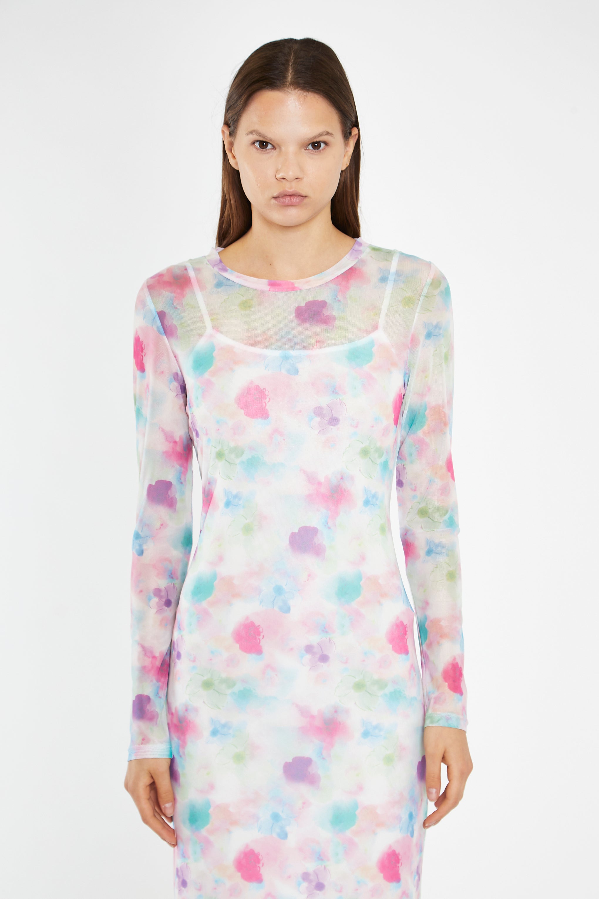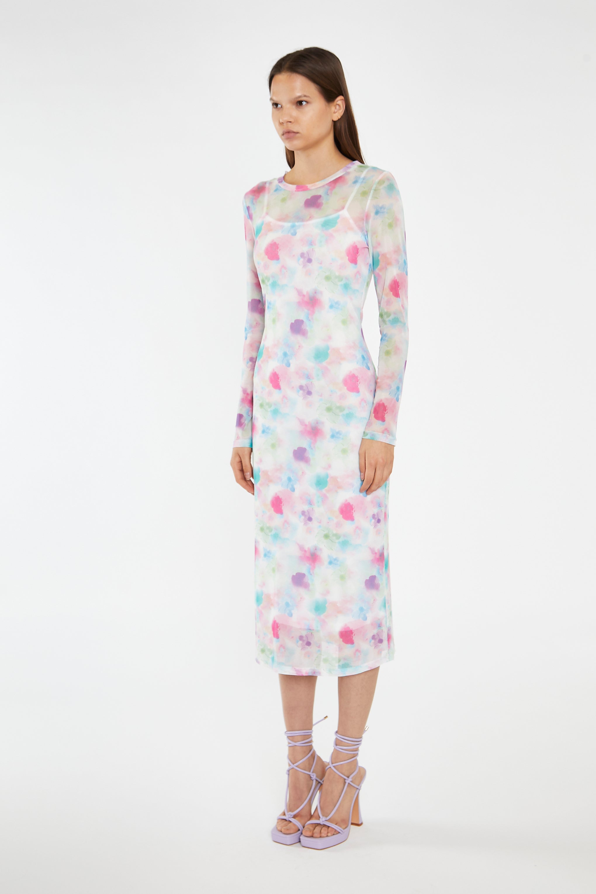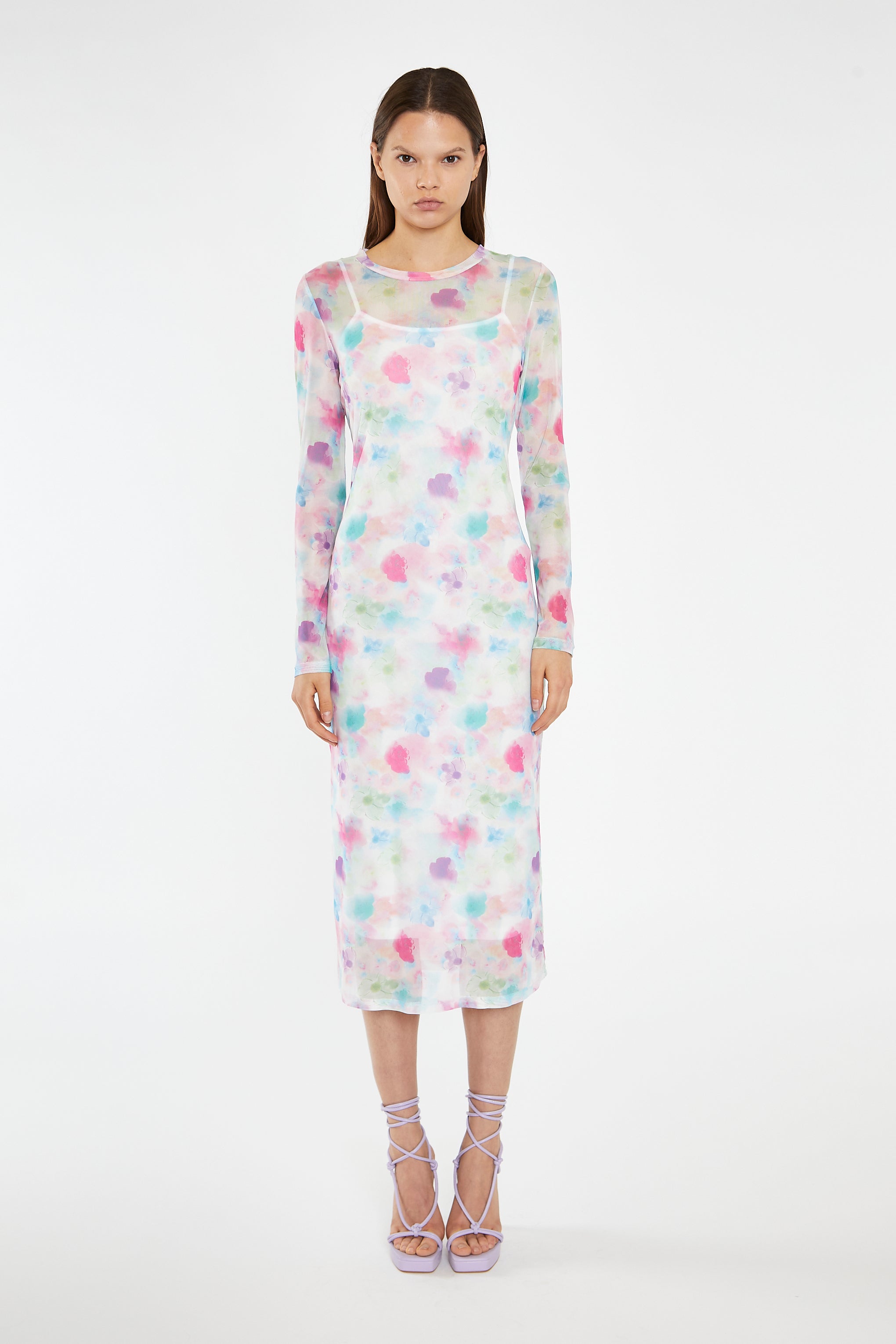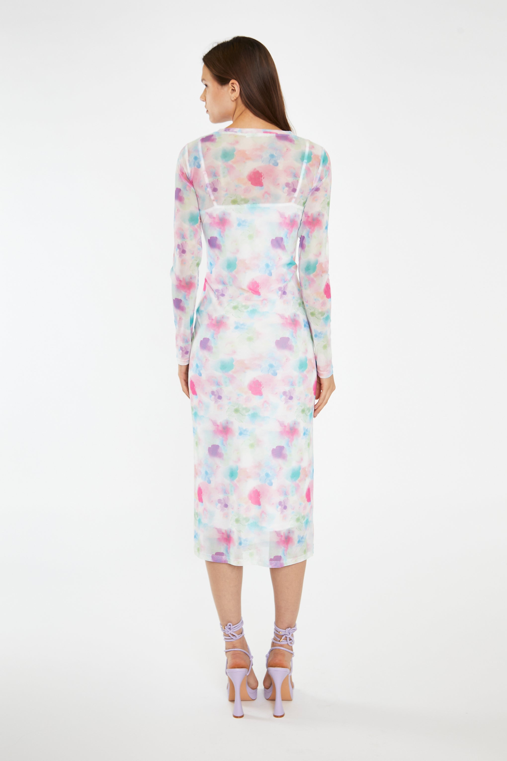 Watercolour-Floral Mesh Long Sleeve Midi-Dress