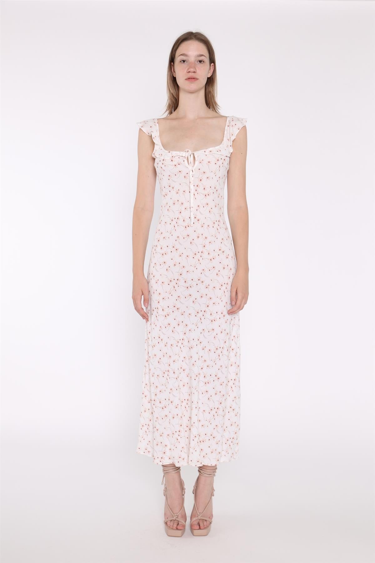 Glamorous Women's White-Base Floral Ruffle Neck Midaxi-Dress. Bring a touch of elegance and femininity to your wardrobe with this midaxi-dress. The ruffle neckline and keyhole detail add a playful twist to the tailored fit, while the bias-cut design creates a flattering silhouette. Whether you're dressing up for a special occasion or looking for a versatile and sophisticated look, this dress is sure to make a statement.