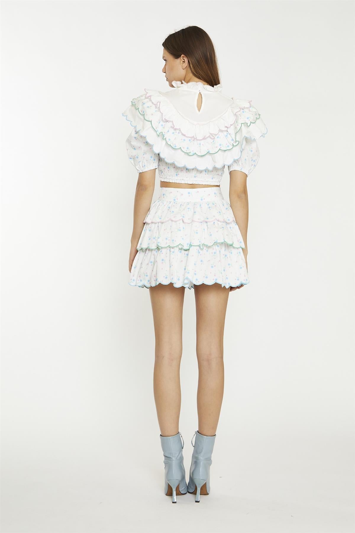 Glamorous Women's White Blue Pink Ditsy Extreme Ruffle Crop-Top. This playful crop top features a charming ditsy floral print in white, blue, and pink, perfect for adding a pop of colour to your wardrobe. The extreme ruffle detailing gives it a fun and flirty vibe, while the shirred waist ensures a comfortable and flattering fit. Short statement sleeves add a touch of drama without overwhelming the design. The cropped length is ideal for pairing with high-waisted bottoms, creating a balanced silhouette. For a coordinated look, team it with the matching skirt, or mix it up with your favourite jeans or shorts. This top is versatile enough for a casual day out or a summer party. Layer it under a denim jacket for cooler evenings, or wear it on its own to showcase its unique design. With its blend of comfort and style, this crop top is sure to become a favourite in your summer rotation.