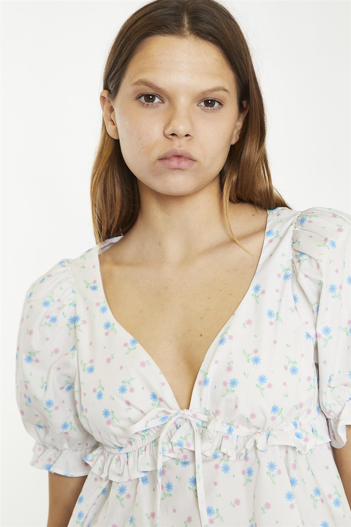 White/Blue/Pink Ditsy V-Neck Crop-Top