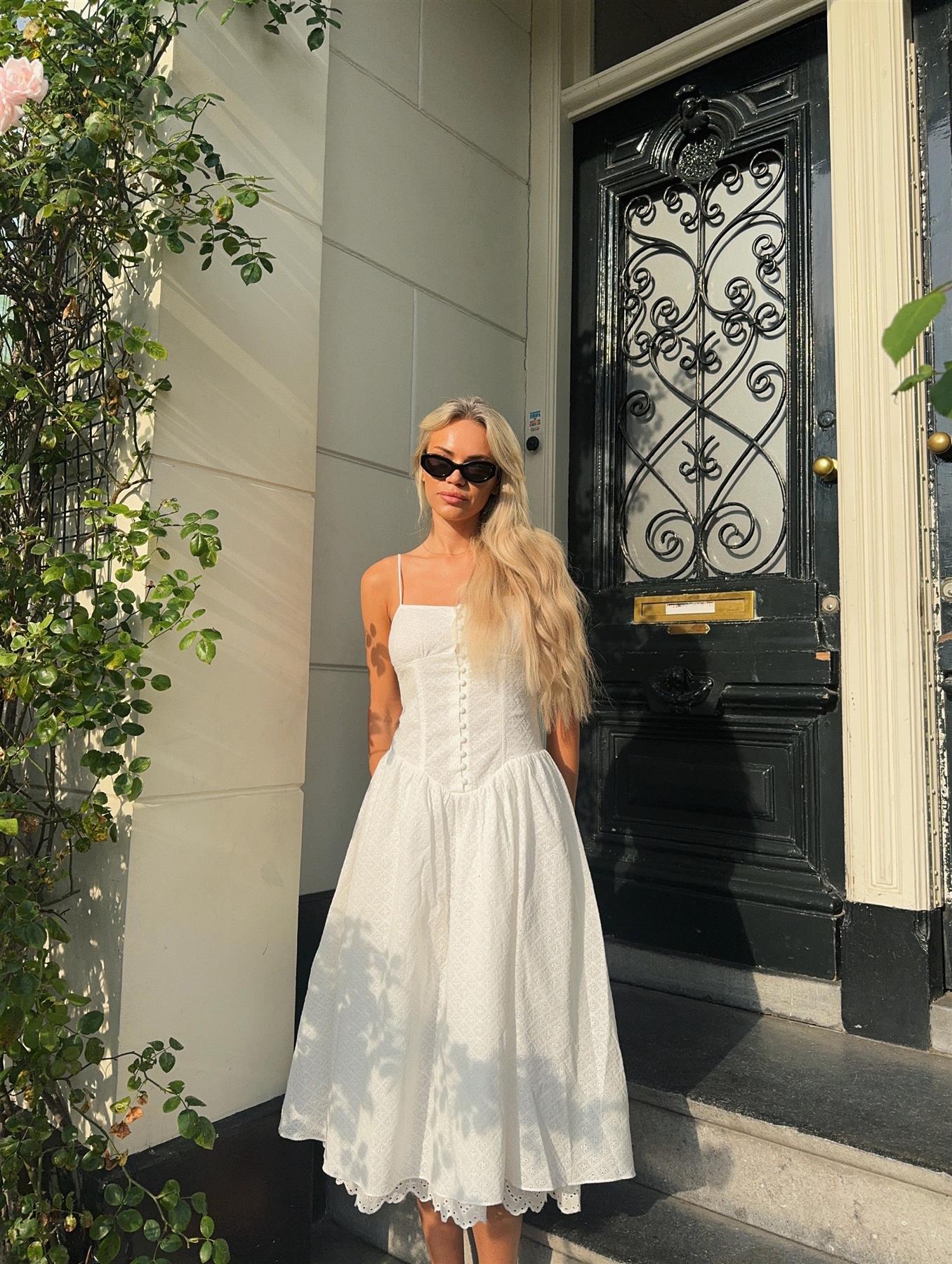 Collective the Label Women's Dayana Women's White Broderie Pleated Maxi-Dress. The White Dayana Broderie Pleated Maxi-Dress is a stunning piece that combines elegance with comfort. This sleeveless beauty features delicate spaghetti straps and a flattering square neckline, perfect for showcasing your favourite necklace. The button-front detail adds a touch of vintage charm, while the corset detailing cinches the waist for a lovely silhouette. The pleated fabric flows gracefully from the waist down, creating a romantic and ethereal look. A concealed zip fastening at the back ensures a smooth fit and easy dressing. This maxi dress is ideal for summer weddings, garden parties, or any special occasion where you want to feel both comfortable and stylish. Pair it with strappy sandals and a small clutch for a classic look, or dress it down with flat sandals and a denim jacket for a more casual vibe. The broderie fabric adds a beautiful texture that catches the light, making this dress a true showstopper.