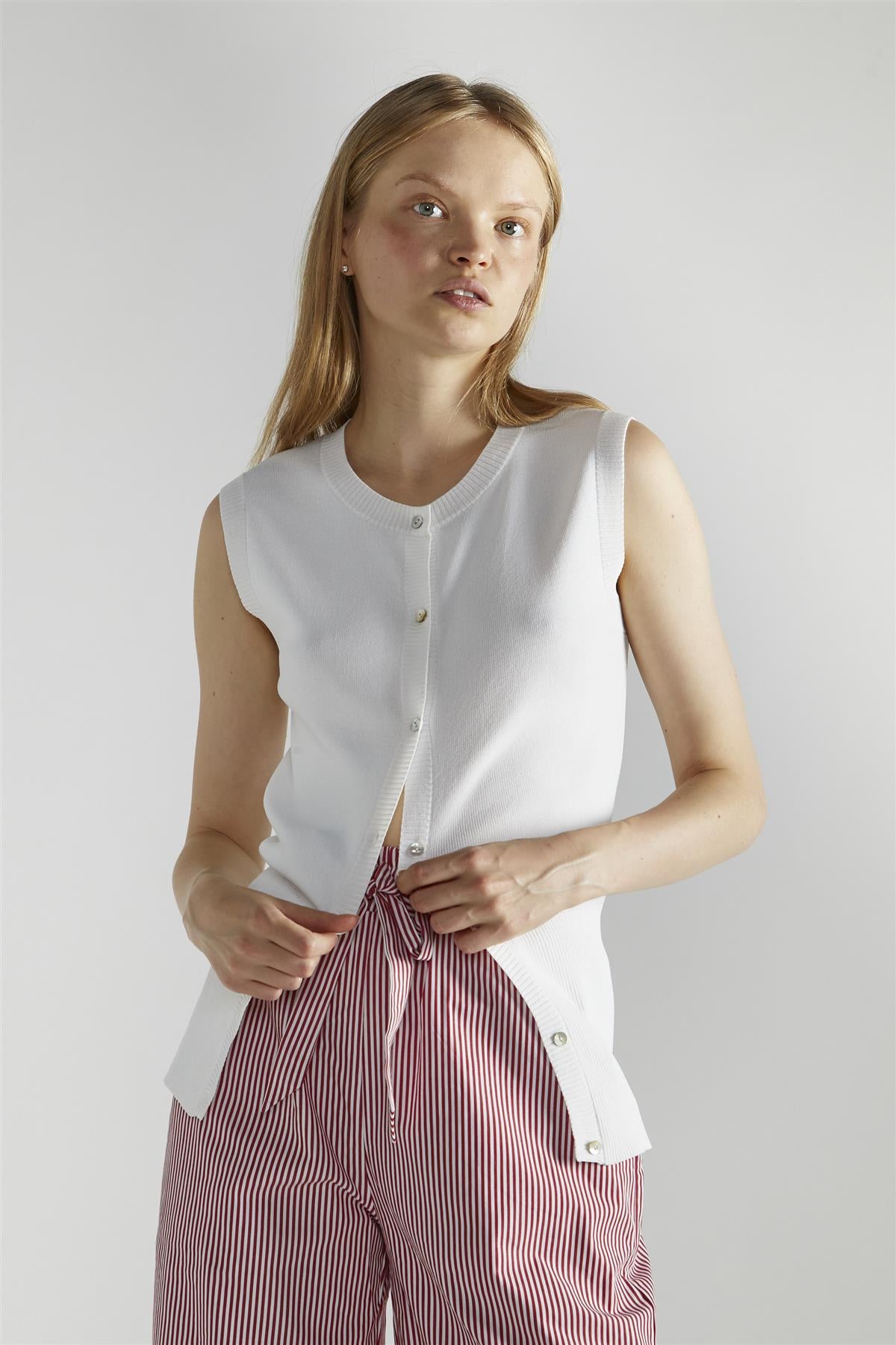 Glamorous Women's White Button Front Vest-Top. This button-front vest top is a wardrobe essential that combines comfort and style effortlessly. Crafted from a soft blend of 55% viscose and 45% polyamide, it offers a luxurious feel against your skin while maintaining its shape wear after wear. The maxi length provides elegant coverage, making it perfect for layering or wearing on its own. Its sleeveless design keeps you cool on warm days and allows for easy movement. The button-front detail adds a touch of classic charm, allowing you to adjust the neckline to your liking. This versatile piece transitions seamlessly from day to night - pair it with jeans and sneakers for a casual lunch date, or dress it up with a statement necklace and heels for evening events. The neutral hue makes it a perfect canvas for accessorizing, letting you express your personal style with ease. It's the kind of top that you'll