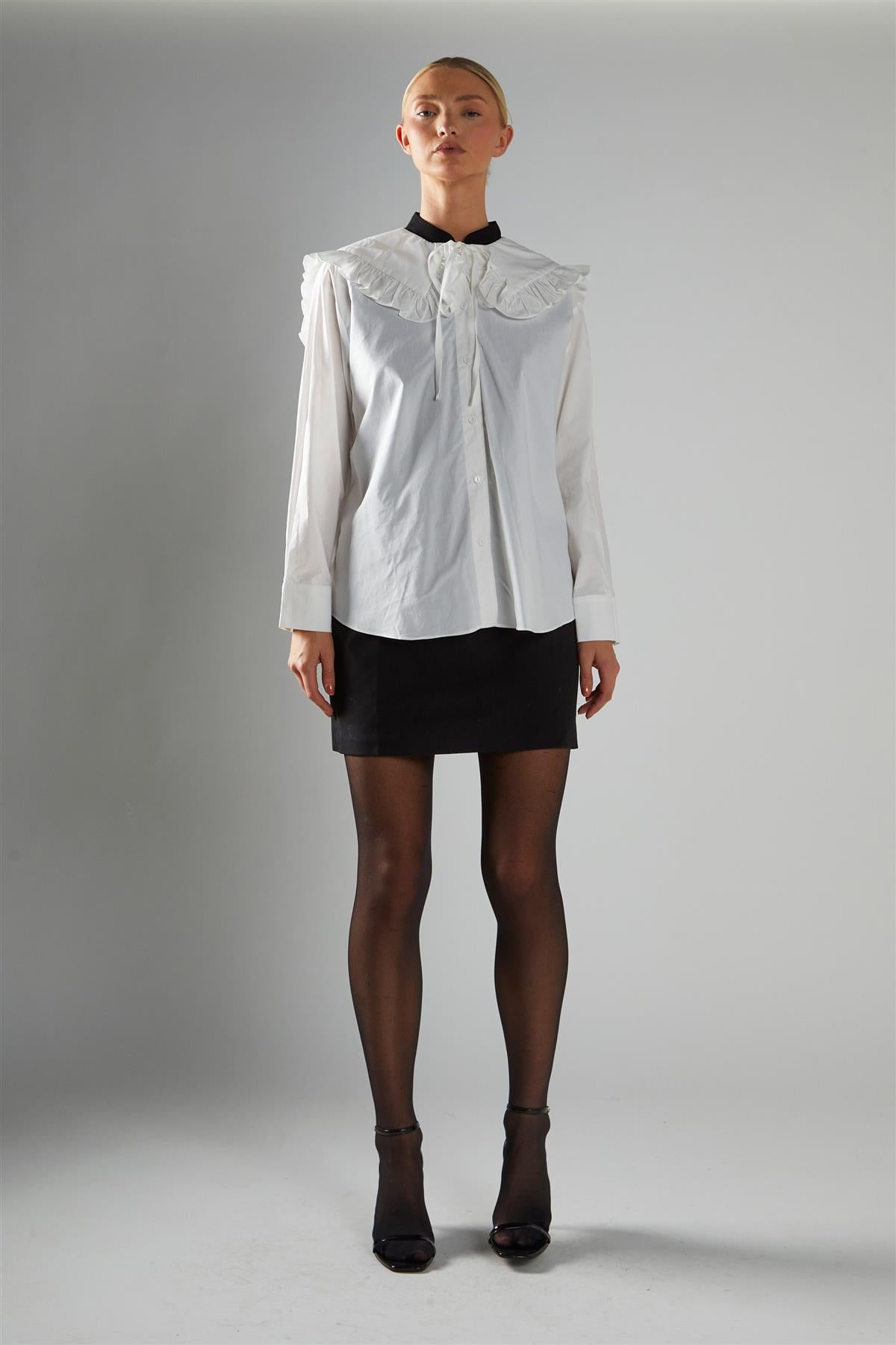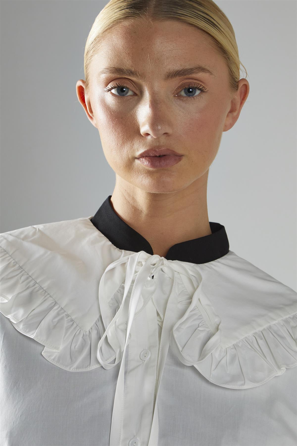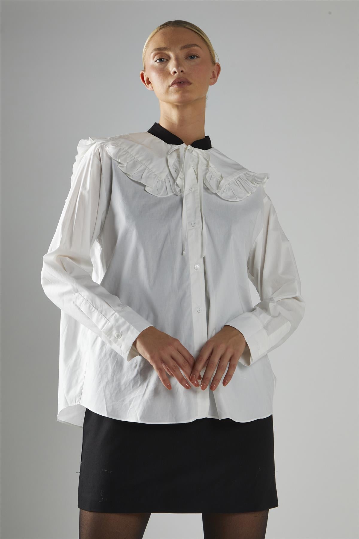 Glamorous Women's White Collared Shirt. This collared shirt brings a fresh, easy-going charm to your collection, thanks to its oversized collar trimmed with a soft ruffle hem that adds just the right amount of detail. The tie front gives you the freedom to adjust your look—knot it up for a playful finish or leave it loose for a more relaxed feel. Long sleeves and a loose fit make this shirt comfortable to wear all day, offering plenty of room to move and layer as you like. The crisp fabric feels light against your skin, making it a breeze to pair with jeans for a casual outing or tuck into a skirt for something a bit more polished. It’s a piece that quietly stands out, bringing a gentle touch of style to your everyday routine.