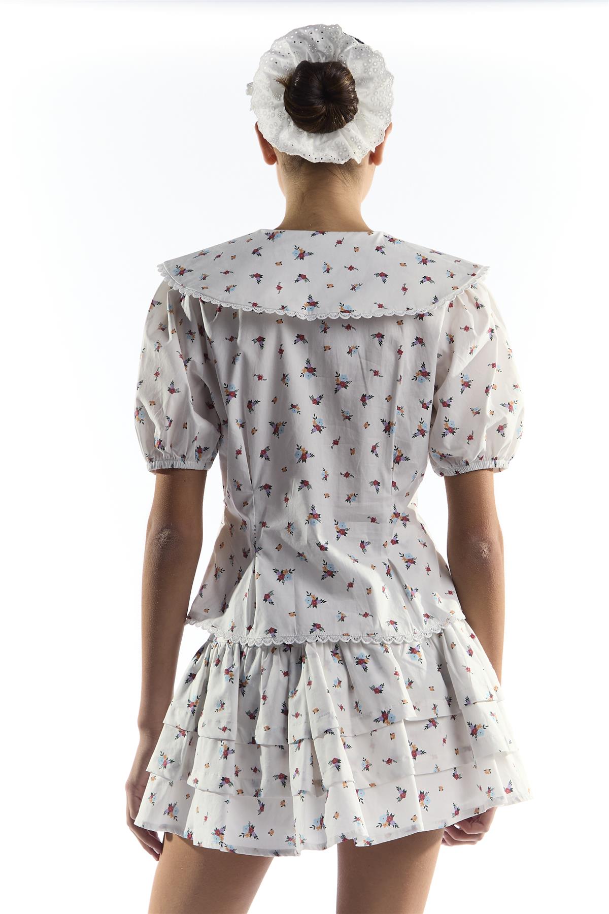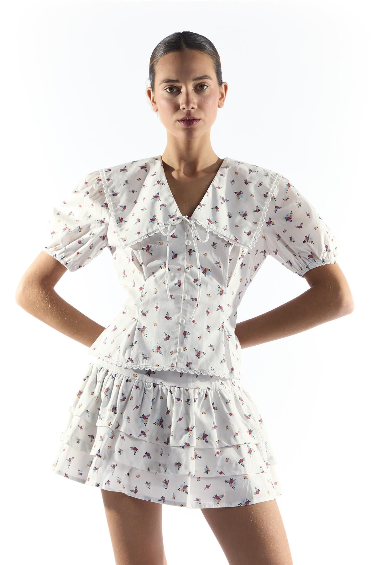 Collective the Label Women's White Floral Peplum Mini Skirt With Pin Tucks. Romantic detailing and soft structure make this blouse a timeless piece with modern charm. A V-neckline creates an elegant shape that flatters effortlessly, while puff sleeves add gentle volume and a touch of femininity. The oversized collar becomes the standout feature, bringing definition and balance to the silhouette while adding a hint of vintage-inspired style. Designed for comfort and versatility, this blouse pairs beautifully with both casual and tailored pieces. Style with slim trousers or a fitted skirt for a look that feels polished, confident, and effortlessly put together.