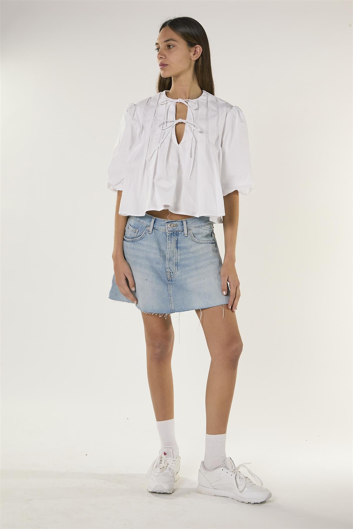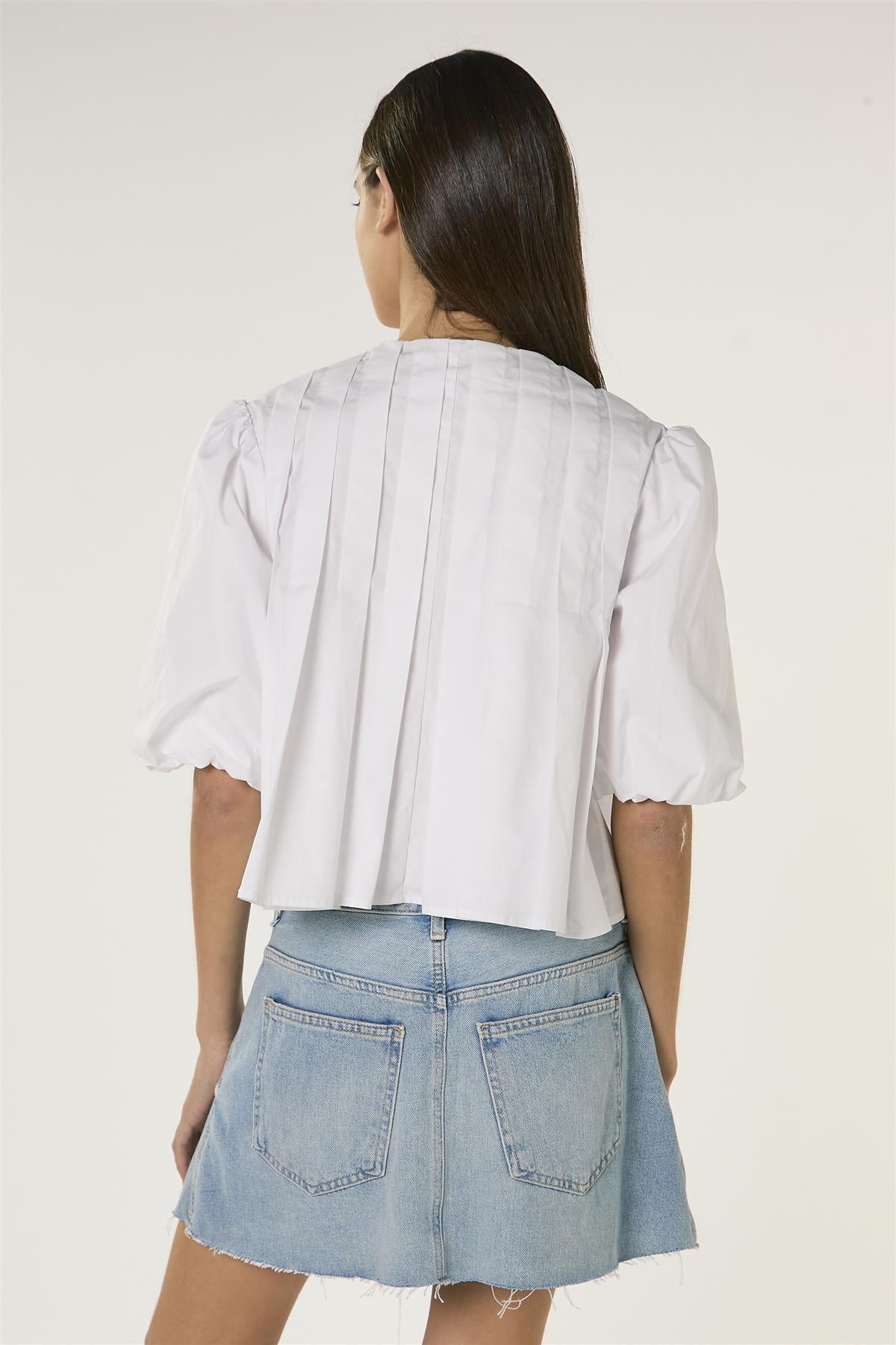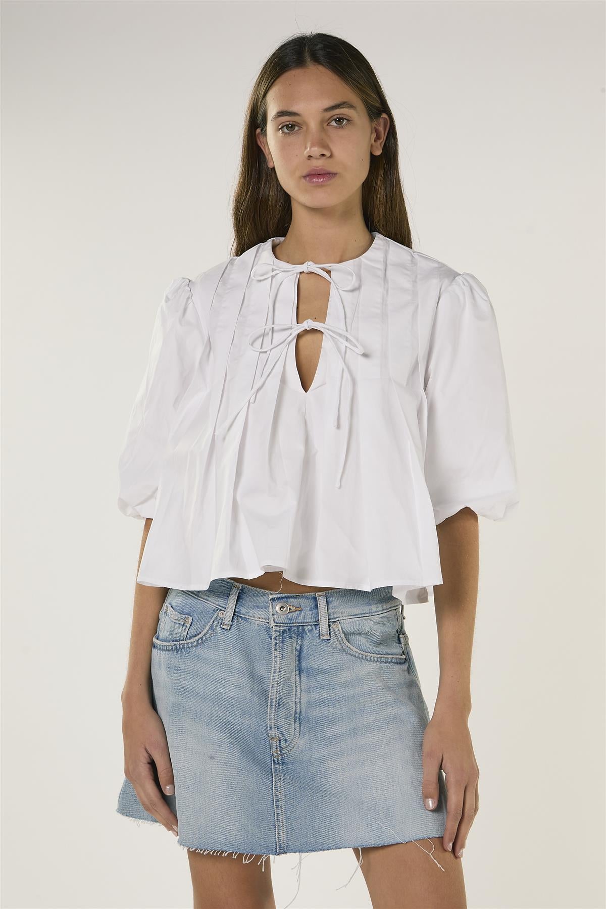 Glamorous Women's White Front Tie Pleated Blouse. Add a touch of effortless sophistication to your wardrobe with this white front tie pleated blouse, designed to make everyday dressing feel easy and polished. The pleated front and back create subtle texture and movement, while the tie-front detail adds a playful, adjustable fit that highlights your waist naturally. A classic round neckline keeps the look simple and versatile, and puff sleeves bring gentle volume for a stylish, modern silhouette. Pair with tailored trousers for a smart, office-ready outfit, or tuck into a skirt for a relaxed, feminine vibe that carries from day to evening with ease.