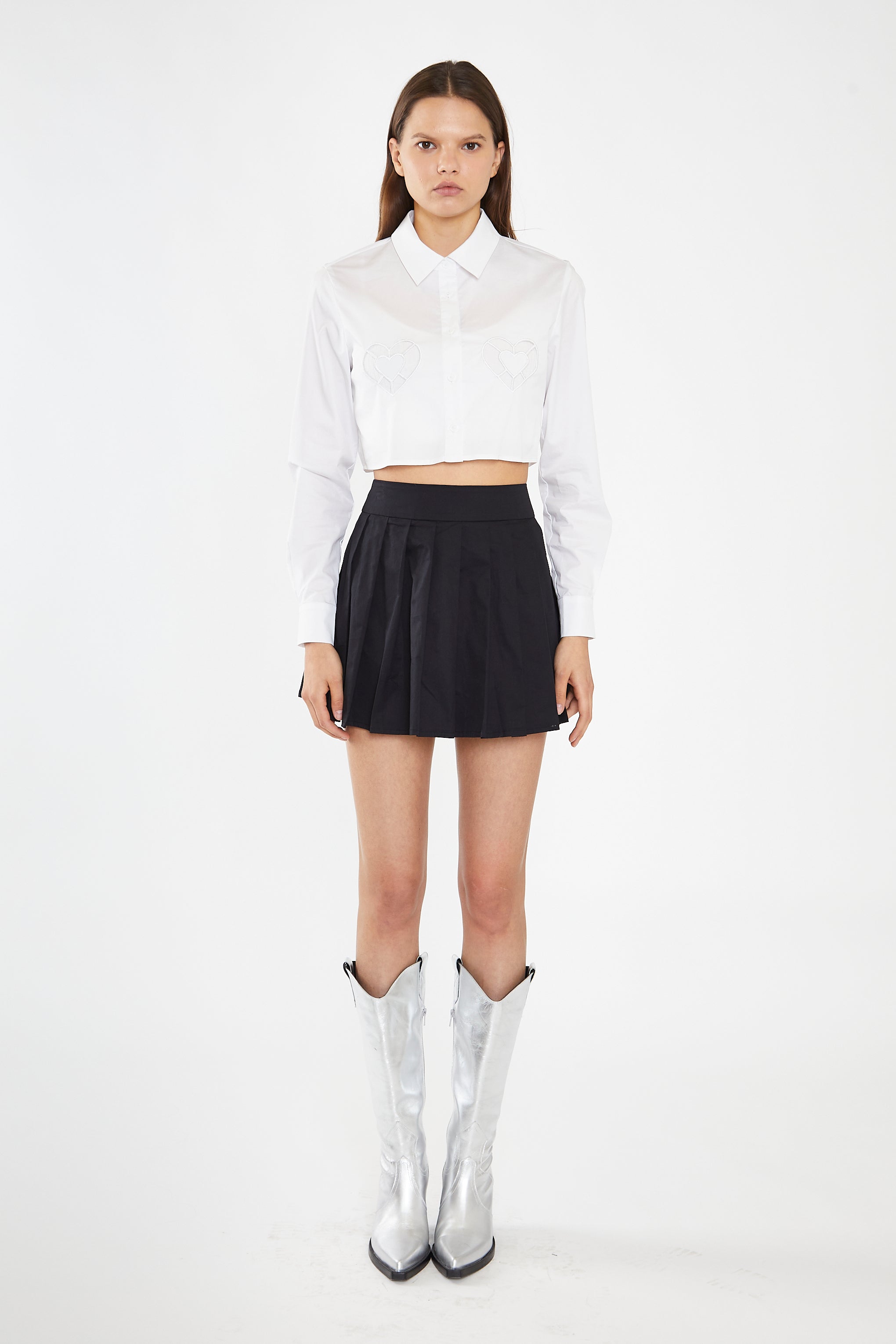 Glamorous Womens White Heart Cut-Out Crop-Shirt. Be the heart of the party in this ultra-cute, cropped button-down! Show off your playful side with the heart-shaped cut-outs, and get ready to take a sweet stylish risk. Make all the other fashion hearts skip a beat!