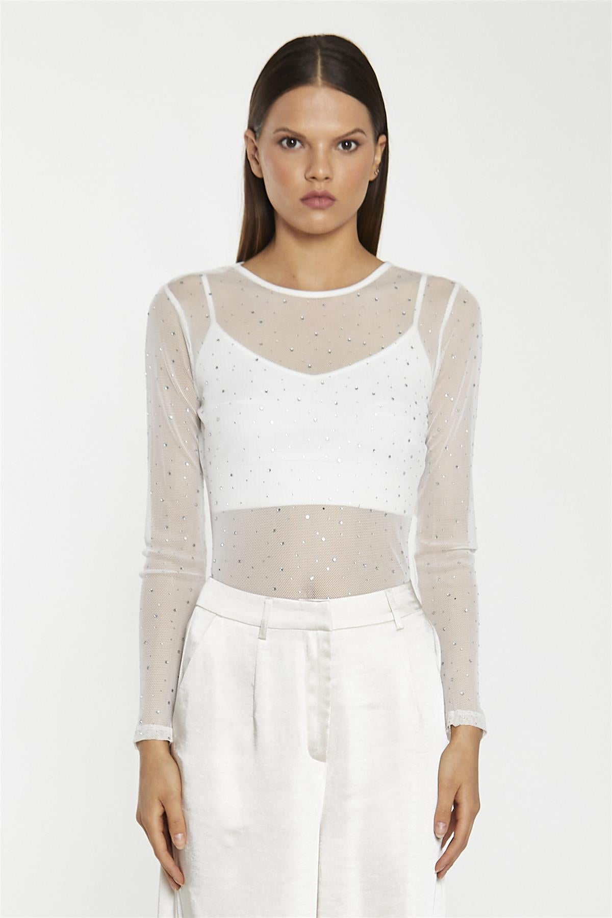 Glamorous Women's White-Mesh Diamante Classic-Bodysuit. Get ready to shine bright in this stunning white mesh diamante bodysuit. The sparkling diamante fabric catches the light with every move, creating a mesmerizing effect that's sure to turn heads. The classic bodysuit silhouette offers a sleek, streamlined look that's perfect for tucking into your favourite high-waisted bottoms. The long sleeves and crew neck provide a touch of coverage, while the bodycon fit hugs your curves in all the right places. Whether you pair this bodysuit with jeans for a night out or tuck it into a satin midi skirt for a more formal occasion, it's guaranteed to have you feeling confident and fabulous. The versatile white hue makes it easy to mix and match with your existing wardrobe. Slip into this sparkling mesh bodysuit and get ready to dazzle - it's the perfect way to add a touch of glamour to your everyday style..