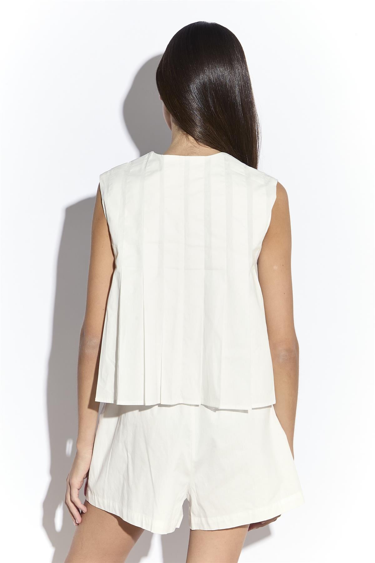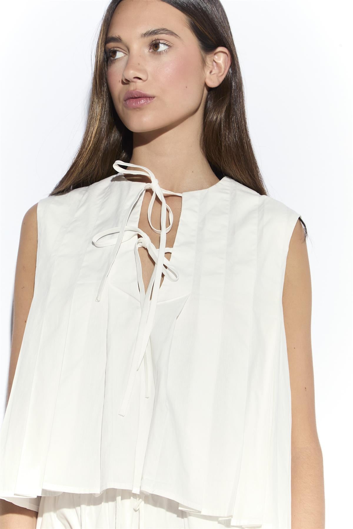 Narrated Women's White Pleated Tie Front Blouse. Refined simplicity meets thoughtful detail in this pleated tie front blouse, designed to bring an elegant touch to your everyday styling. The round neckline offers a clean, timeless frame, while the sleeveless cut keeps the look light and versatile. Clear pleats at the bodice add gentle texture and structure, creating a flattering shape that feels effortlessly polished. Finished with rouleau ties at the front, it introduces a delicate, feminine twist that can be styled loose or neatly fastened. Style with tailored trousers or skirts for an understated, sophisticated look that transitions with ease.
