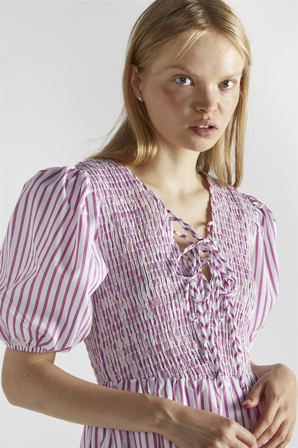 Glamorous Women's White-Purple-Stripe Tie-Front Midi-Dresses. Hey there, fashion enthusiast! Let's chat about this charming tie-front midi dress that's about to become your new wardrobe superstar. The playful stripes add a dash of fun to your look, while the midi length strikes that sweet spot between flirty and elegant. The tie-front detail is like a little bow on a present - it cinches your waist just right and adds a touch of whimsy to the overall design. Those above-elbow sleeves are a dream for those in-between weather days, giving you just enough coverage without overheating. And can we talk about that concealed zip fastening at the back? It's like a magic trick - keeping your look sleek and seamless while making it a breeze to slip on and off26. This dress is a true chameleon - pair it with sneakers and a denim jacket for a casual brunch date, or dress it up with some strappy heels and statement earrings for a night out on the town. The fabric feels like a gentle hug against your skin, so you'll be comfy all day long. Trust us, this tie-front wonder is going to have you twirling with joy every time you put it on!