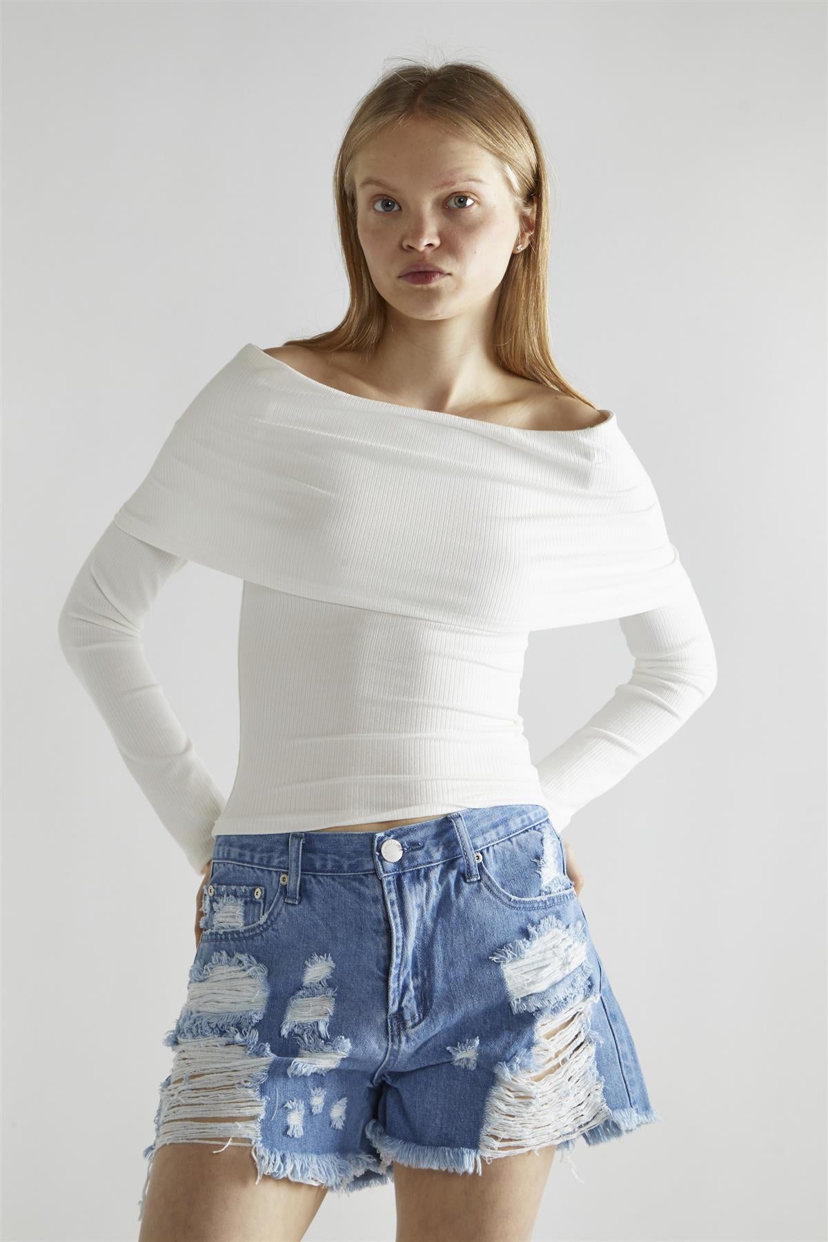 White-Rib Bardot Long-Sleeve Top