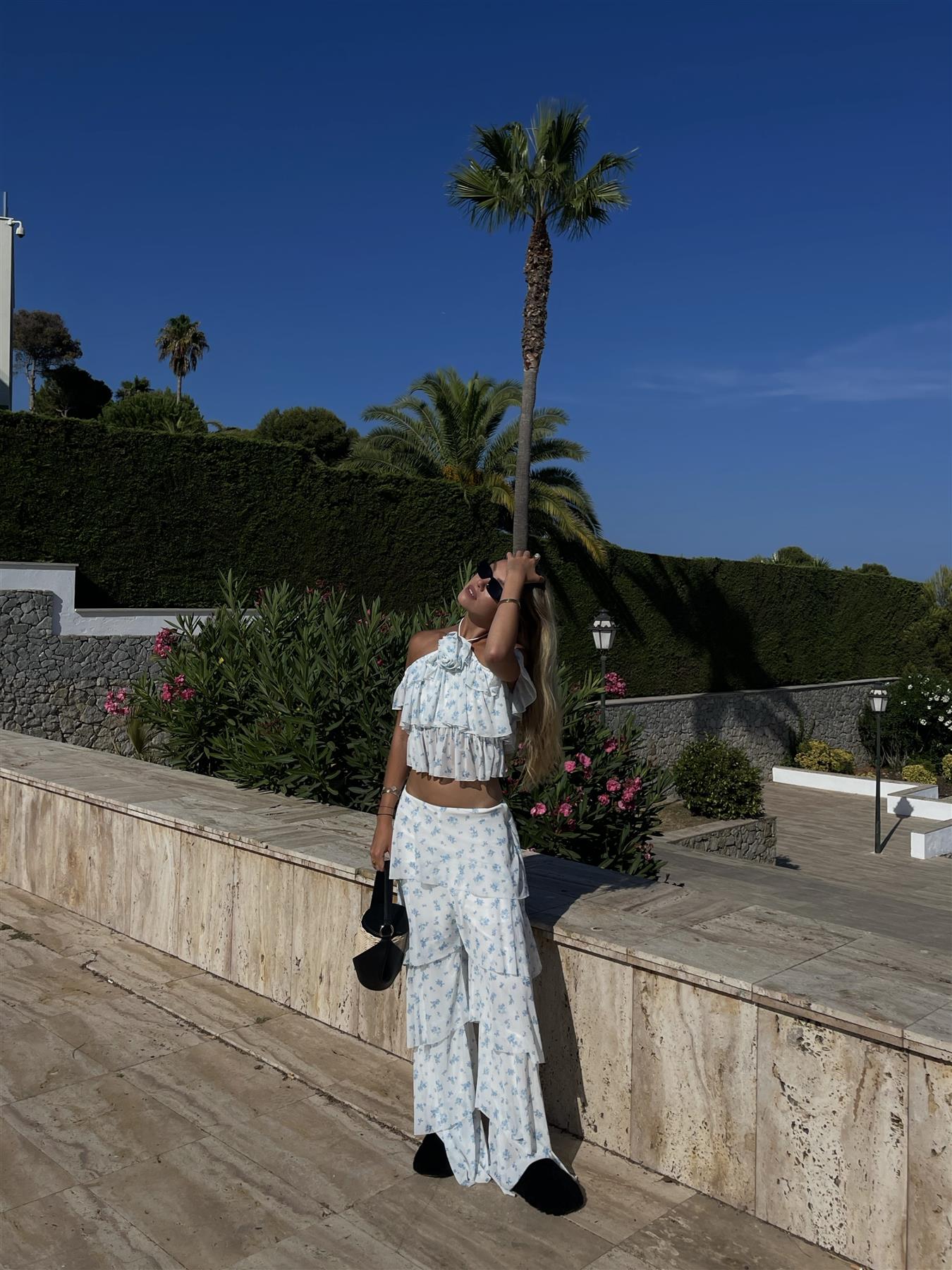 White Sky Blue Ditsy Ruffle Mid-Rise-Trousers