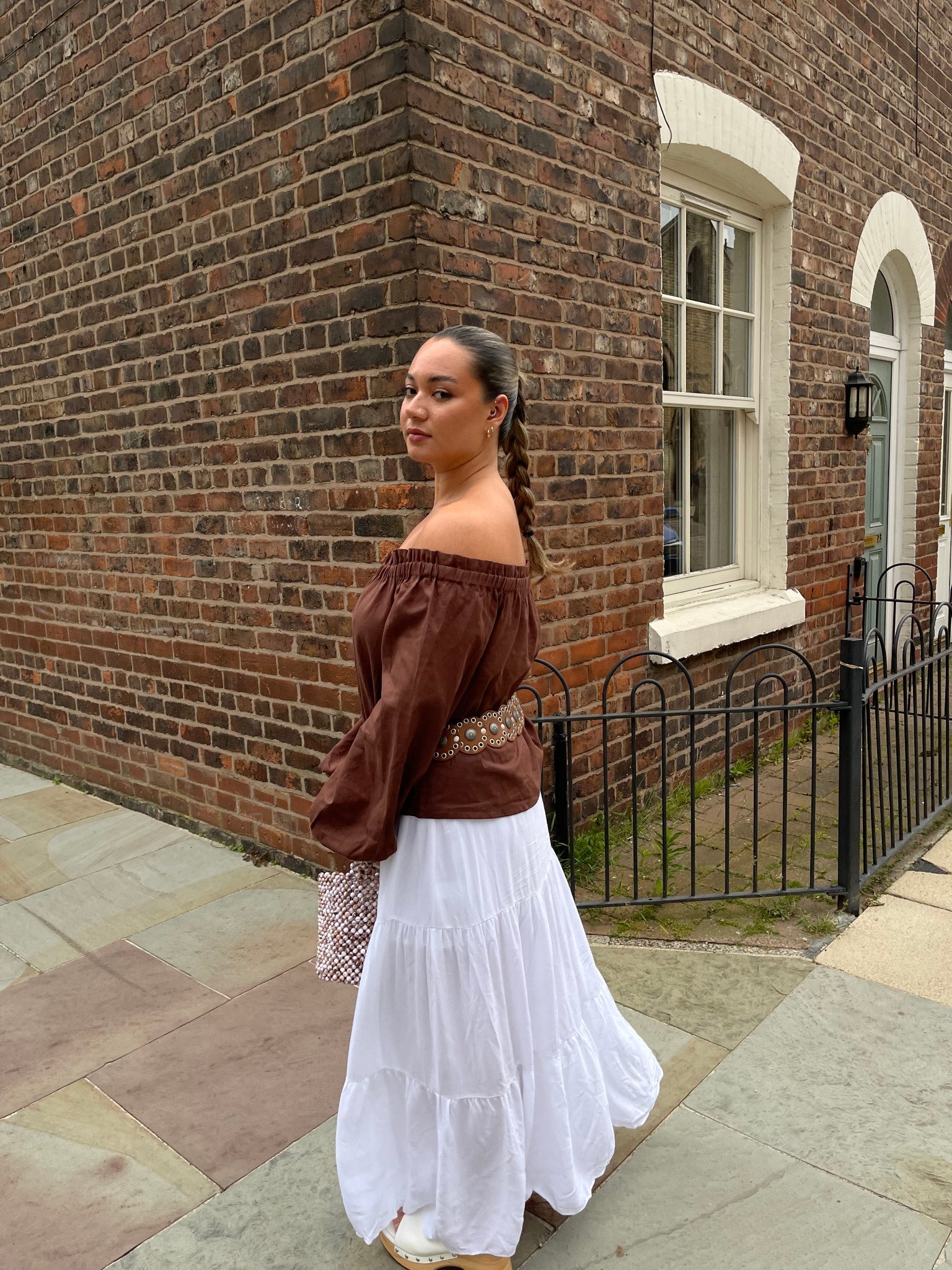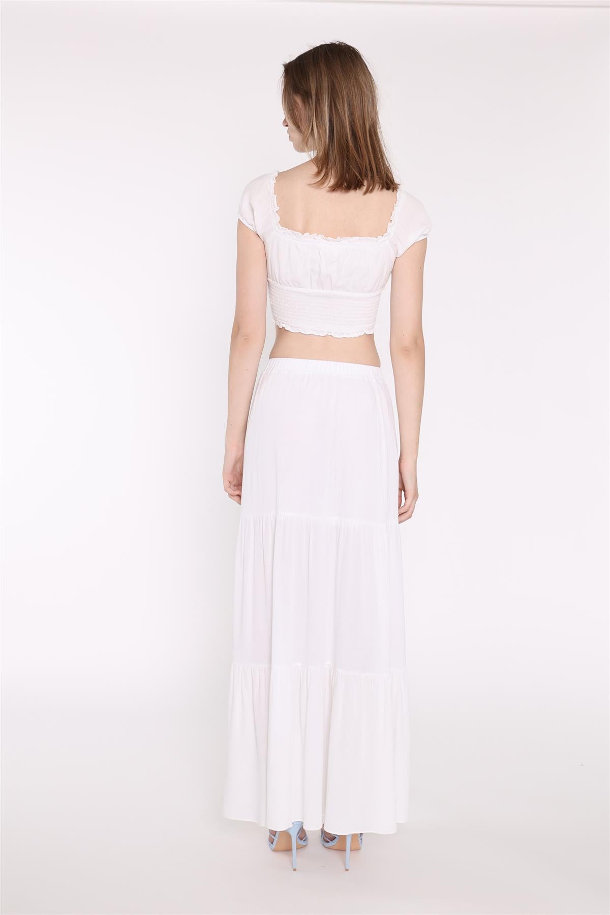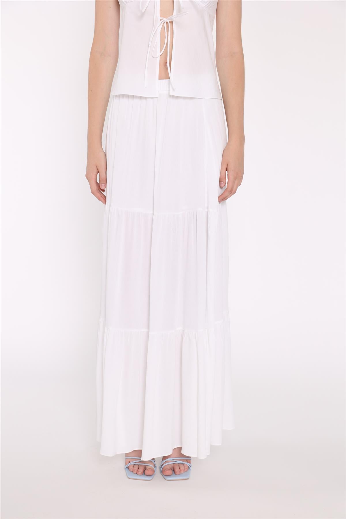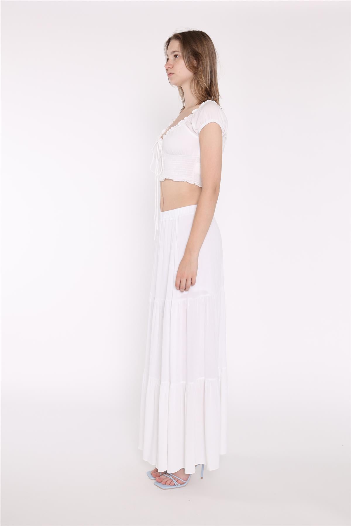 Glamorous White Tiered Maxi-Skirt. Add a touch of elegance to your wardrobe with our White Tiered Maxi-Skirt. This beautiful skirt features an elasticated waistband, ensuring a comfortable and flexible fit for all-day wear. The tiered layers create a flowing silhouette that moves gracefully with every step, making it perfect for both casual outings and special occasions. The maxi length adds a timeless appeal, offering a versatile piece that can be dressed up or down. Pair it with a simple blouse for a relaxed look, or match it with a chic top for a more polished ensemble. The crisp white colour makes it easy to mix and match with your favourite accessories. Enjoy the effortless style and comfort of this skirt, designed to make you feel confident and stylish no matter the occasion..
