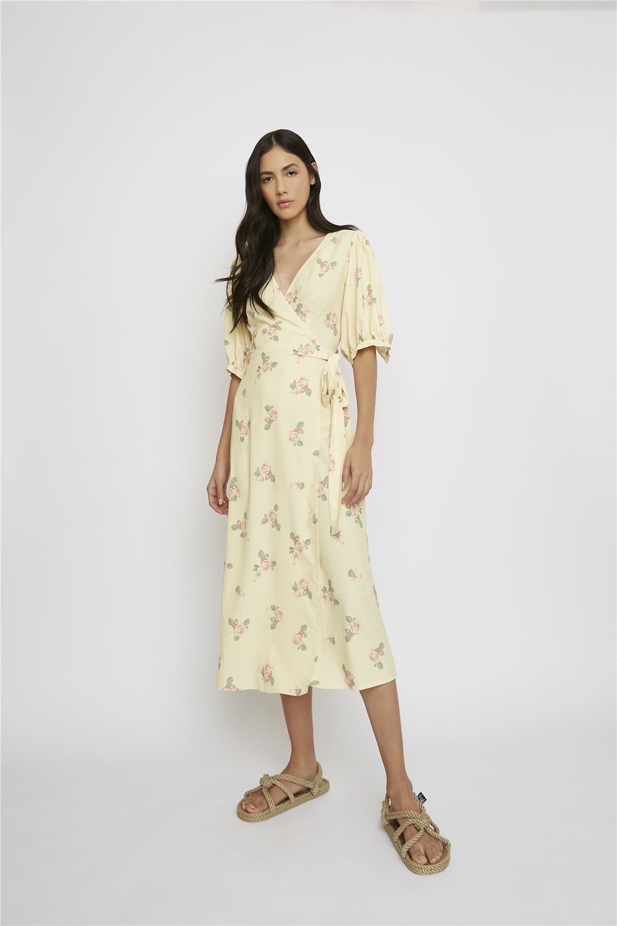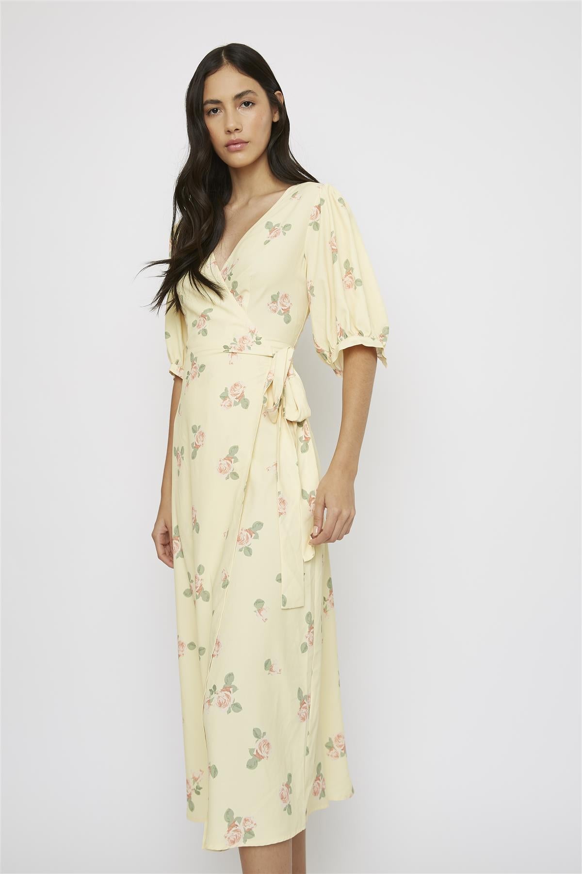 Glamorous Women's Yellow-Pink-Rose V-Neck-Wrap Midi-Dress. This floral wrap midi-dress is a beautiful blend of elegance and ease, making it a standout choice for any occasion. The wrap design flatters your figure by cinching at the waist, while the V-neckline adds a touch of charm and frames your neckline gracefully. Elbow-length statement sleeves provide a soft, romantic feel and add just the right amount of coverage. The vibrant floral print brings a fresh, cheerful vibe that's perfect for sunny days or special gatherings. Pair it with block heels and delicate jewellery for a polished look, or dress it down with flat sandals and a woven tote for a casual outing. The flowy midi length allows for comfortable movement, making it as practical as it is stylish. Add a light cardigan or denim jacket for cooler evenings, or accessorize with a wide-brimmed hat for an effortlessly chic daytime outfit. This dress is a versatile piece that will brighten up your wardrobe with its lively colours and flattering design.