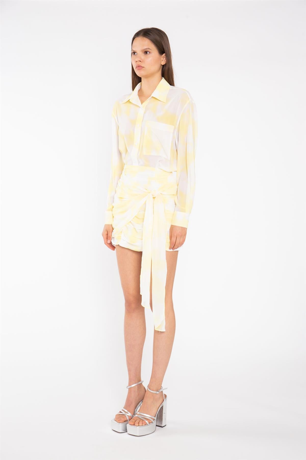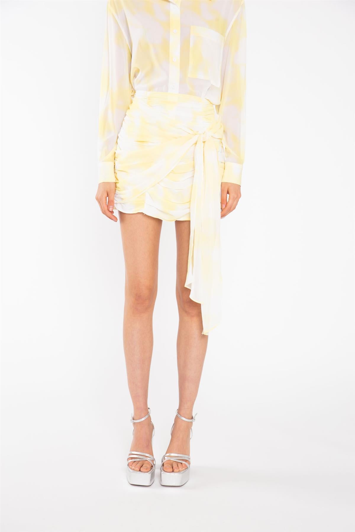 Glamorous Women's Yellow Print-Chiffon Ruched Tie-Front Mini-Skirt. Add a playful touch to your wardrobe with this Yellow Mini-Skirt. Made from lightweight chiffon and featuring a unique ruched design, this mini-skirt is perfect for a fun and flirty look. Complete the set with the matching top for an eye-catching ensemble.